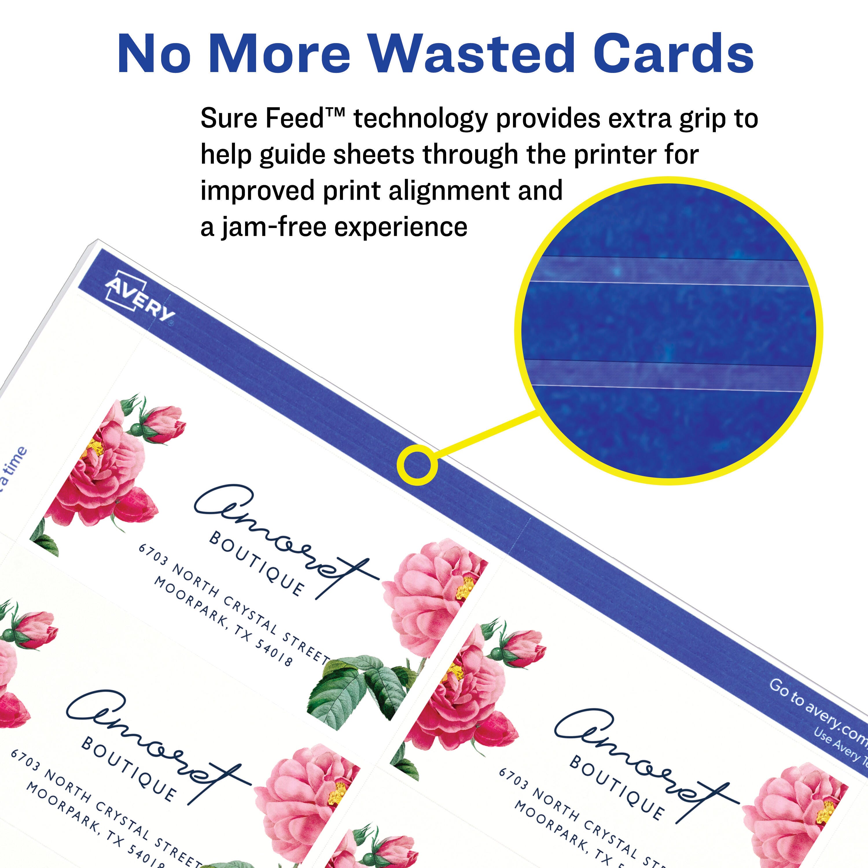 Avery Two-Side Printable Premium Clean Edge Business Cards allow you to design and print your own professional-looking business cards in minutes. Avery's patented Clean Edge technology ensures that cards snap apart with smooth, non-perforated edges. True Print technology allows for improved alignment of text and images for great results. Print on both sides; use the back of the card for maps, directions, product or price lists, appointment reminders, coupons, photos, calendars, etc. High-quality, heavyweight cardstock is coated on both sides for vibrant color and sharp text. Print only the amount of cards you need when you need them and change them as often as you like. No minimum order quantities, no wait time, no shipping charges. Easy to customize with free templates, designs, and QR codes at Avery Design and Print Online (avery.com/print).