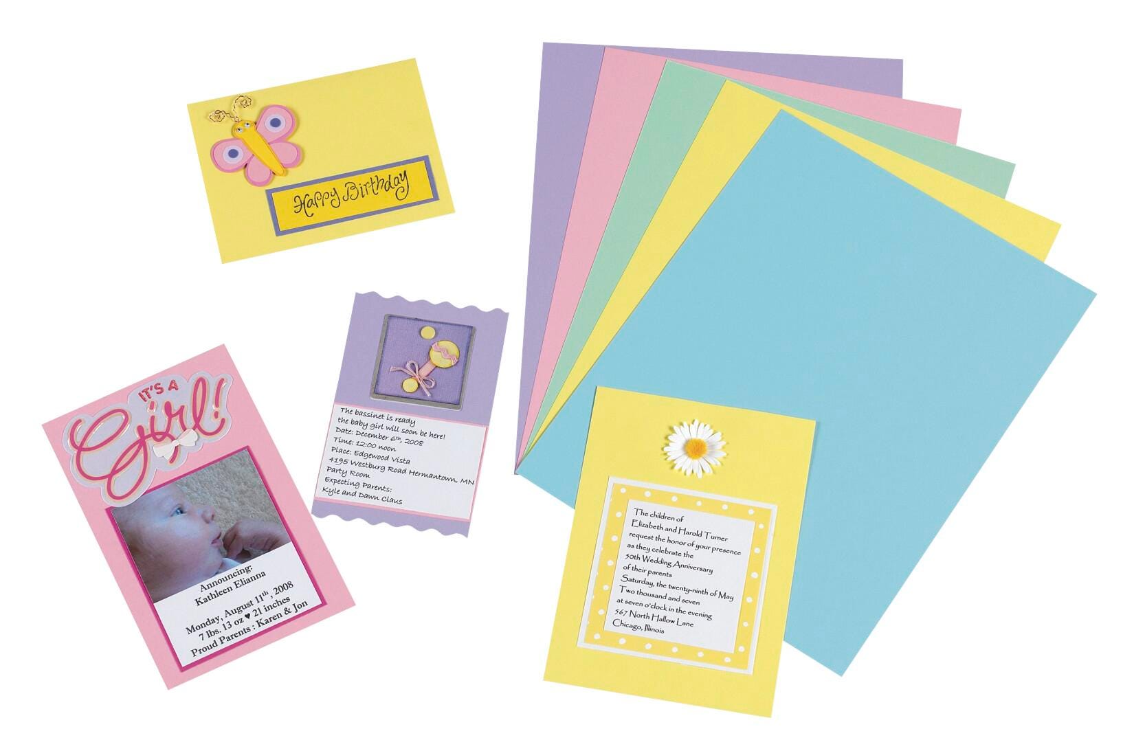 This pack of Array Card Stock is perfect for greeting cards, postcards, report covers, rubber stamping, memory books, flyers, announcements, and more. Compatible with most standard inkjet and laser printers and photocopies. This acid-free and lignin-free card stock comes in a pack of 100 sheets. The paper's basis weight is 65 pounds. Assorted pastel colors included are Pink, Blue, Canary, Green, and Lilac.Features
