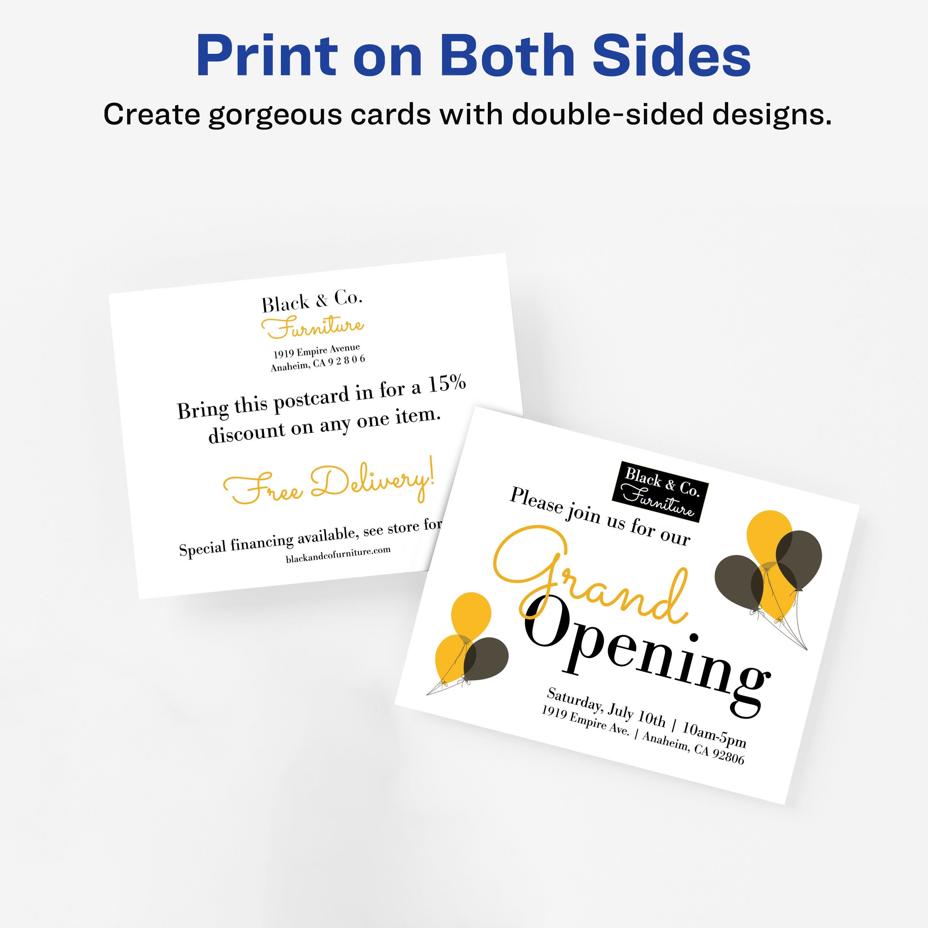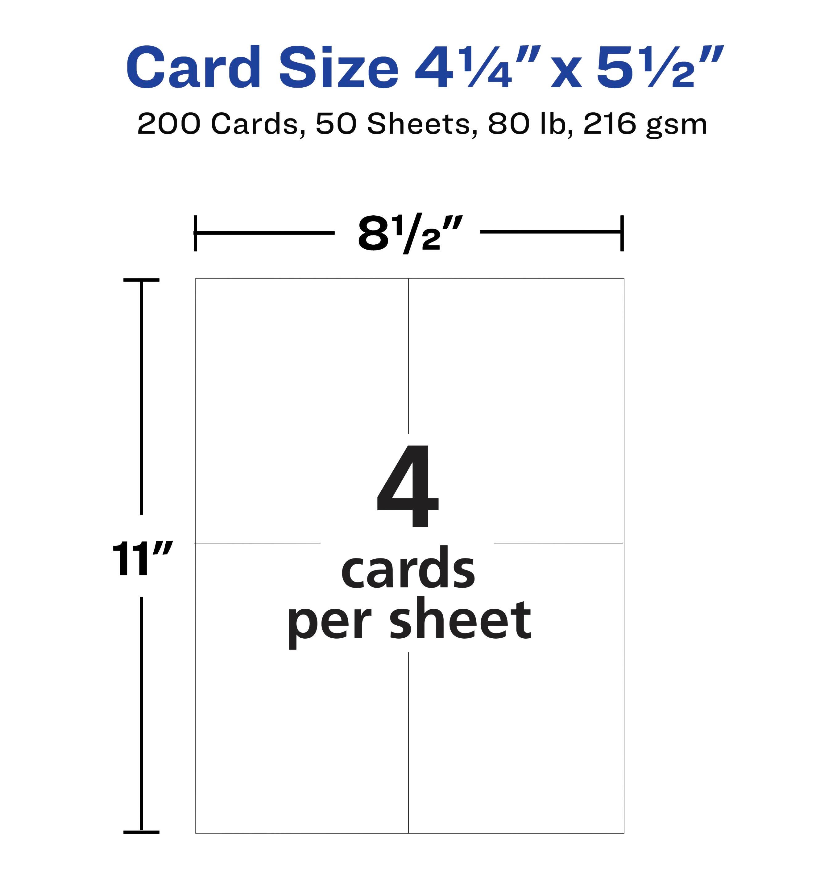 Creating your own postcards is quick and easy with Avery customizable postcards. Whether you want to add a personal touch to Thank You cards, event invitations, important announcements, or other marketing collateral, these printable cards are the perfect blank canvases for beautiful custom designs. Cut from quality cardstock with eight 80 pounds/ 216 grams per square meter, every 8-1/2 x 11 inch sheet of this pack of 100 features a series of meticulous perforations that make it easy to tear each card apart while still leaving behind a smooth, clean edge. Both sides of the postcard paper are optimized for laser printers, allowing for crisp, double-sided designs, and the patented Sure Feed technology grip strip is designed to help alignment and reduce printer jams. Explore a variety of templates available to help create custom postcards at Avery.com/templates. These 4- 1/4 x 5-1/2 inch postcards meet U.S. postal regulations for mailing; which means you just need the address and proper postage, and it's good to go. No envelopes needed.