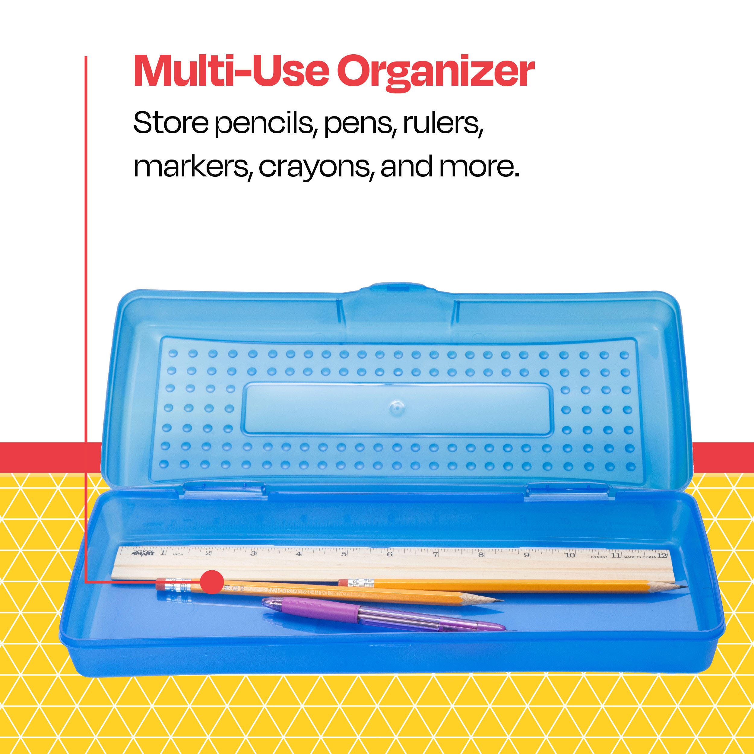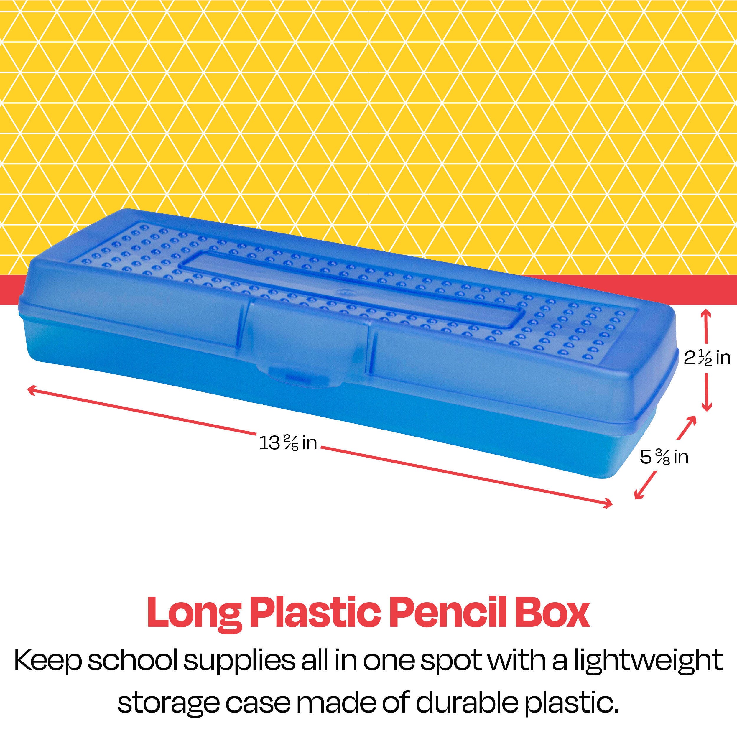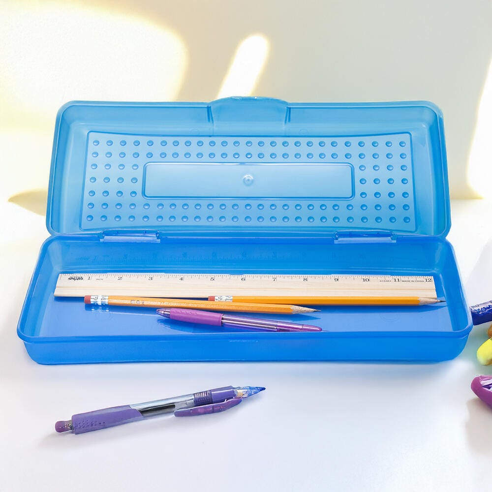 A sleek design and durable plastic construction make the School Smart long pencil box case a top choice for students and teachers. This blue pencil box features an easy-to-use snap-shut latch to keep your writing utensils all in one spot. Students and teachers love the long organizer for scissors, rulers, pens, pencils, and more.