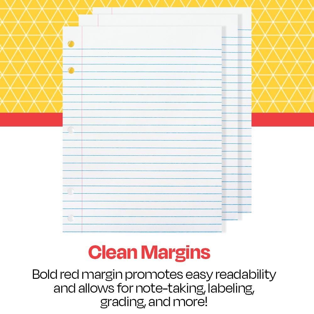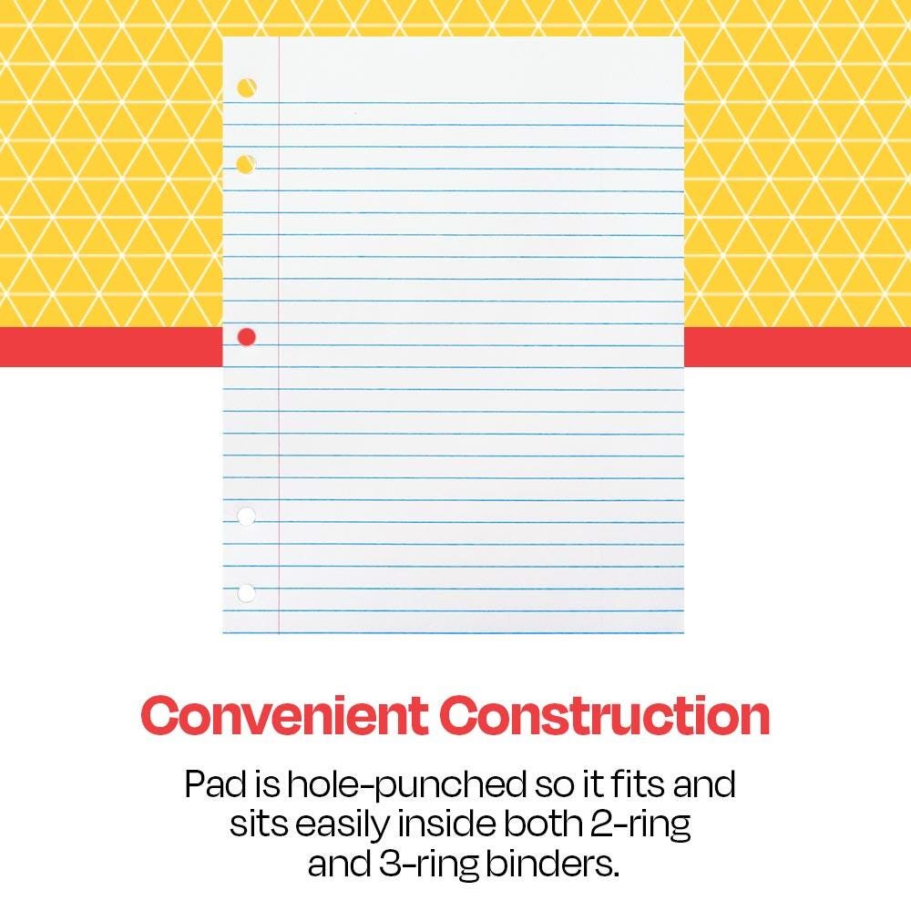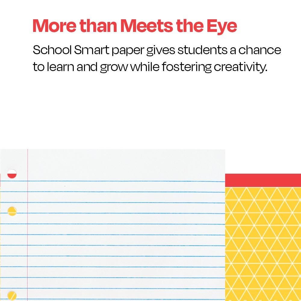 School Smart Punched Theme Pad with heavy chipboard backing features white, 15 lb sulphite paper that is 3/8 inch ruled on both sides with red margin. Pad measuring 8 x 10-1/2 inches is 5-hole punched for all types of binders or covers and includes 50 sheets.