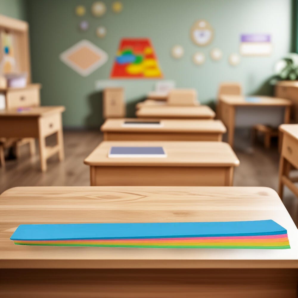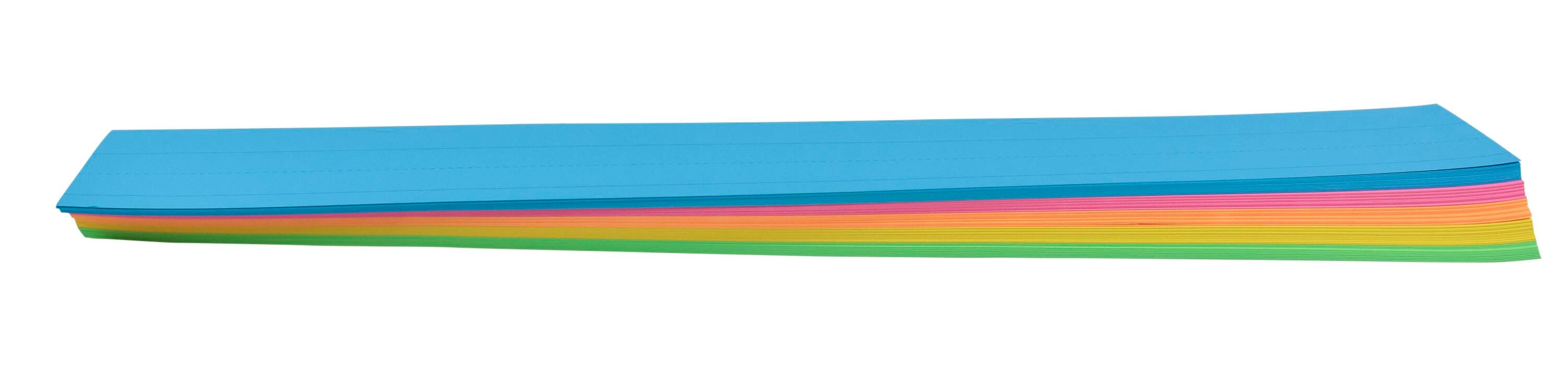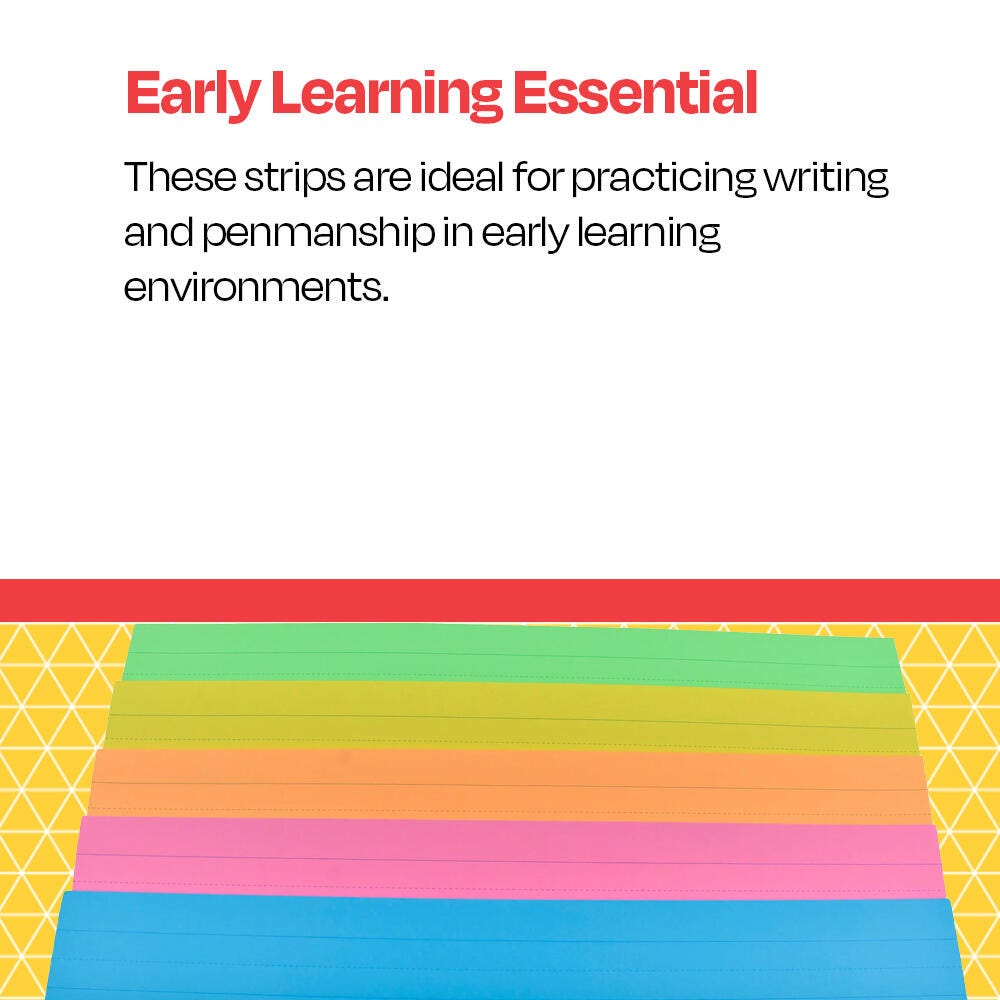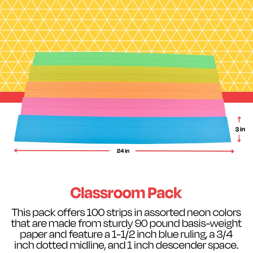 School Smart assorted neon color sentence strips come in a fun design. The cards have a 1-1/2 inch blue ruling, a 3/4 inch dotted midline, and 1 inch descender space. Each fluorescent paper strip measures 3 L x 24 W inches and has a 90 lb basis weight. Assorted neon colors include: orange, pink, blue, green, and yellow.