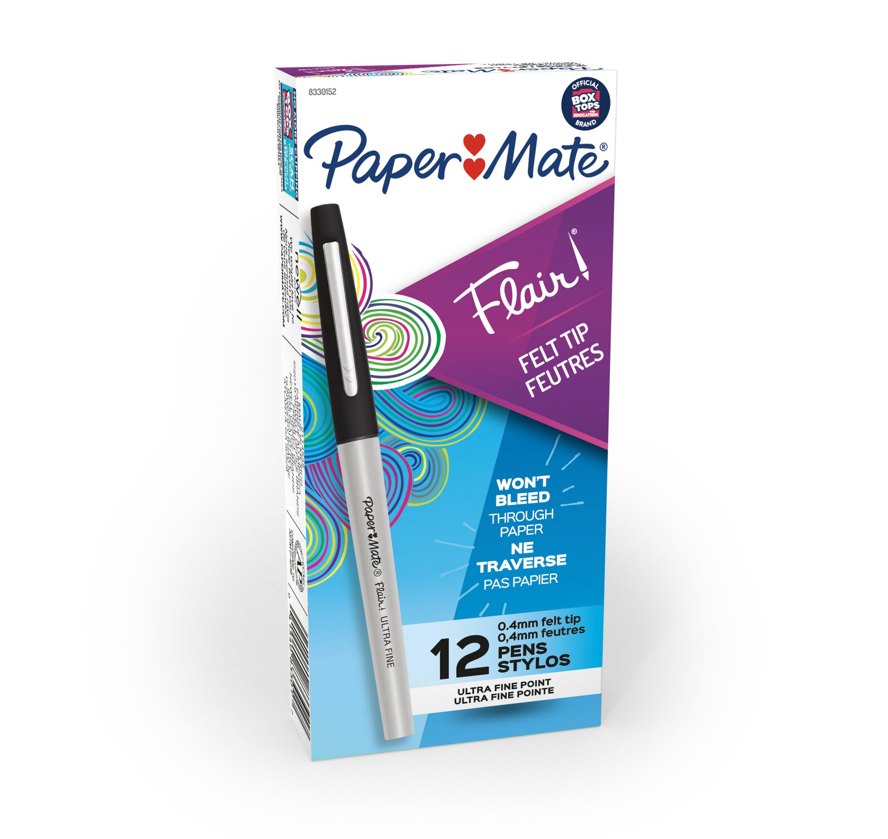 The Flair Felt Tip Pens from Paper Mate feature an ultra-fine 0.4 mm point and reliable water-based, fade- and smear-resistant ink that won't bleed through the page. The fine point produces thin, precise lines that are great for writing, drawing, doodling, coloring, and more.