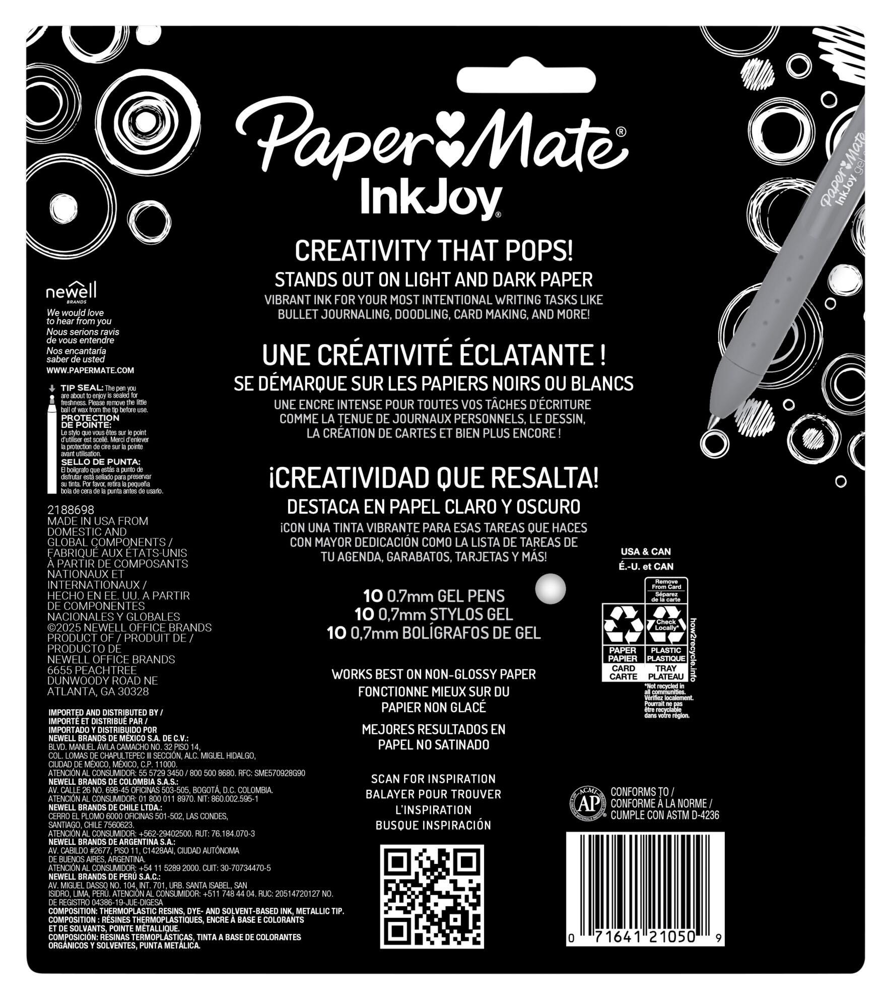 Paper Mate InkJoy Retractable Gel Pens, Medium Point, 0.7 mm, Retractable, Assorted Bright Colors, Set of 10