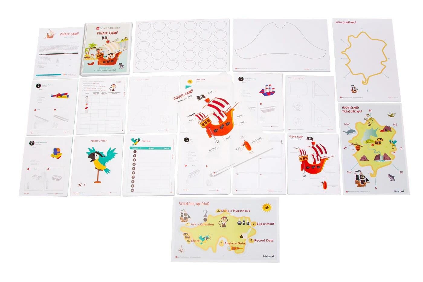 bouyancy, maps, engineering, catapult, STEM Lesson Titles: Becoming a Pirate Pirate Ship Build Buoyancy Tippy Raft Design Challenge Treasure Maps Maps and Pacing Treasure Hunt Catapults Under Siege Design Challenge Knots Sea Shanties Fun & Games!Instructor Guide, 30 printed sets of student pages, a digital curriculum download and all the supplies needed for 12 days of thrilling activities: 2 lb modeling clay: 1 Brick separator: 1 Classic BrickLAB BrickPacks (3250+ building bricks): 5 Colored pencils: 60 Dry-erase markers: 31 Heavy-duty dry-erase page pockets for reusing handouts: 31 Mesh bag for washing bricks: 1 Metal washers: 50 Muslin bags for distributing bricks: 31 Pencil sharpeners: 5 Plastic bins: 5 Reusable name tags: 50 Roll of clear tape: 1 Roll of yellow duct tape: 1 Rope (50 ft) Tub with lid for shipping and storage: 1