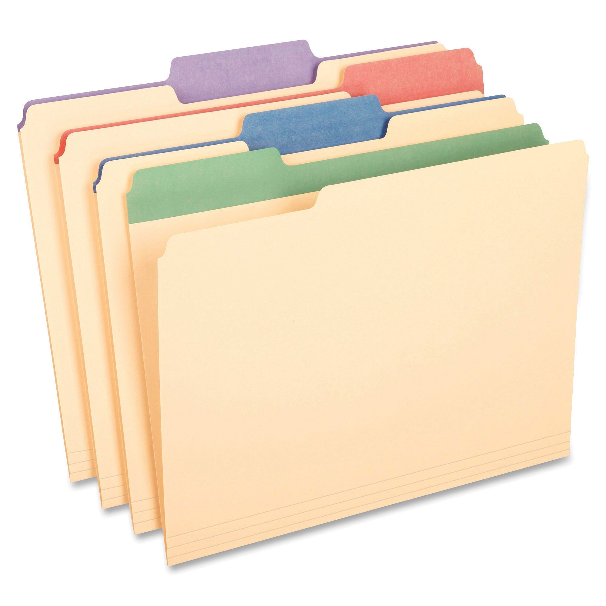 Manila file folders feature exclusive colored tabs. Design makes it easier to find files and adds a colorful flair to your desktop organization system. Prevent misfiles in any filing system with color tabs. Tabs are 1/3 cut in assorted positions and come in blue, red, green and violet. Letter-size folders are made of durable, acid-free, 11 point stock. Colors include violet, red, green, and blue.Includes: 225 Sheet Capacity