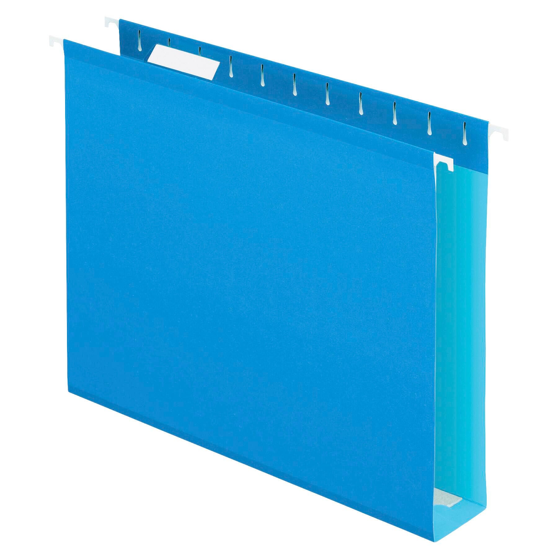 Pendaflex Extra Capacity Reinforced Hanging Folders expand to fit your largest, bulkiest files. A pressboard insert increases capacity 2 inches to hold up to 400 sheets per folder. Polylaminate strips across top and bottom edges resist rips and tears. Each box includes a printer-ready label sheet and 25 clear 1/5-cut tabs. Letter size, blue.Features