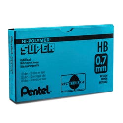 Pentel Super Hi-Polymer HB lead is equivalent to a #2 pencil, guaranteed to scan on tests, resists breaking and never needs sharpening. Each tube of Pentel Super Hi-Polymer HB lead is made of 100% recycled plastic and part of the Pentel Recycology line of products. Produces crisp, fine lines of consistent density. Ideal for all general writing applications such as notes, letters, etc. 30 pieces of 0.7 mm lead included in each tube. Sold as a pack of 12 Tubes.Features