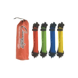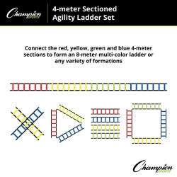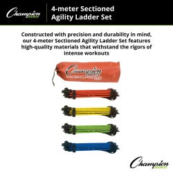 The Champion Sports Agility Ladder Set provides a versatile solution for speed and agility training. Each of the 13-foot ladders can be connected to form a 52-foot multi-colored ladder or a variety of other shapes for different drills, courses, and exercises. A convenient nylon carry bag keeps the set organized and easy to transport. This set includes 4 ladders, with one in each of the following colors: red, yellow, blue, and green.Features