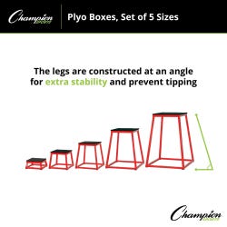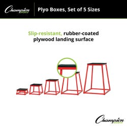 The Champion Sports Plyometric Boxes Set is perfect for stocking your equipment for high-impact training. Each box is made of 1-inch heavy-gauge welded tubular steel for strength and durability. They feature a rubber-coated plywood landing surface that provides optimum grip and slip-resistance. These versatile boxes are a valuable training tool for a variety of plyometric drills, explosive jumps, and speed training. The boxes have angled legs for added stability and non-slip rubber footpads to keep box in place. This set includes 5 plyo boxes, one of each of the following sizes: 6, 12, 18, 24, and 30 inches.Features