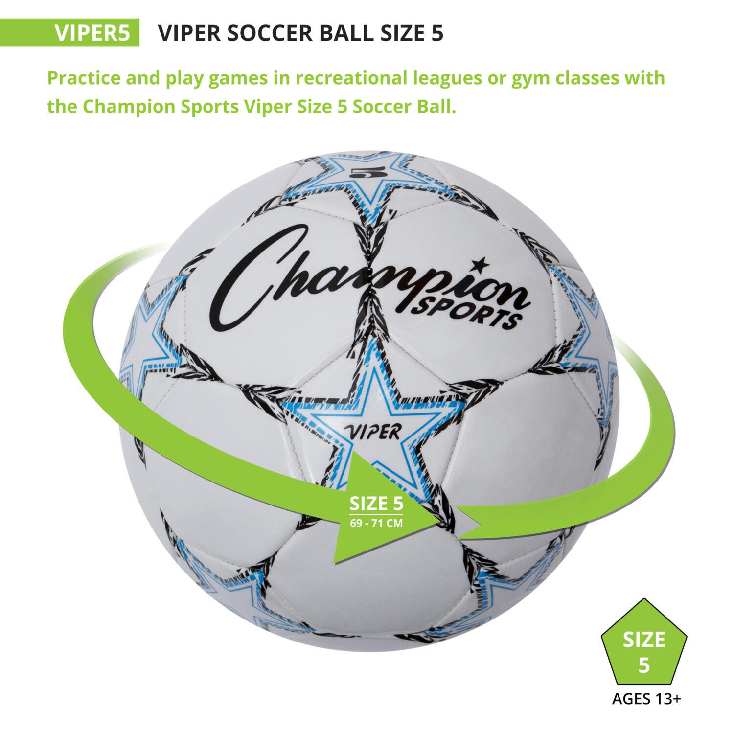 Practice your game with the Champion Sports Viper Soccer Ball. Perfect for recreational leagues and gym classes, this size 5 ball features a premium TPU cover that delivers a soft touch for safer heading, blocking, and kicking. The soccer ball's machine-stitched panels and airlock butyl bladder ensure superior shape and air retention on indoor turf or outdoor fields. The size 5 ball is recommended for ages 12 and up.