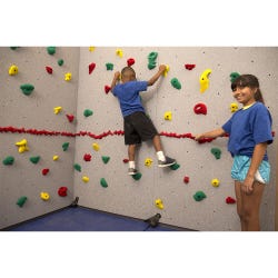 Granite-textured modular 4 x 8 foot panel walls are designed to fit almost any space and keep climbers near the ground. A safety barrier also indicates maximum foot height. The color-coded Groperz Hand Holds offer a variety of options for climbers to use as they climb. Green hand holds are the largest and easiest to grip. The yellow holds come in a variety of sizes and offer a light challenge. The red holds are medium sized and provide the most challenge. Climbers can choose to use any color hand hold, or try the extra challenge of climbing using only hand holds of the same color. Wood and steel panels come fully painted and are simple to install (or for professional installation, call School Specialty Customer Care for a price quote).Wall Set Includes:
