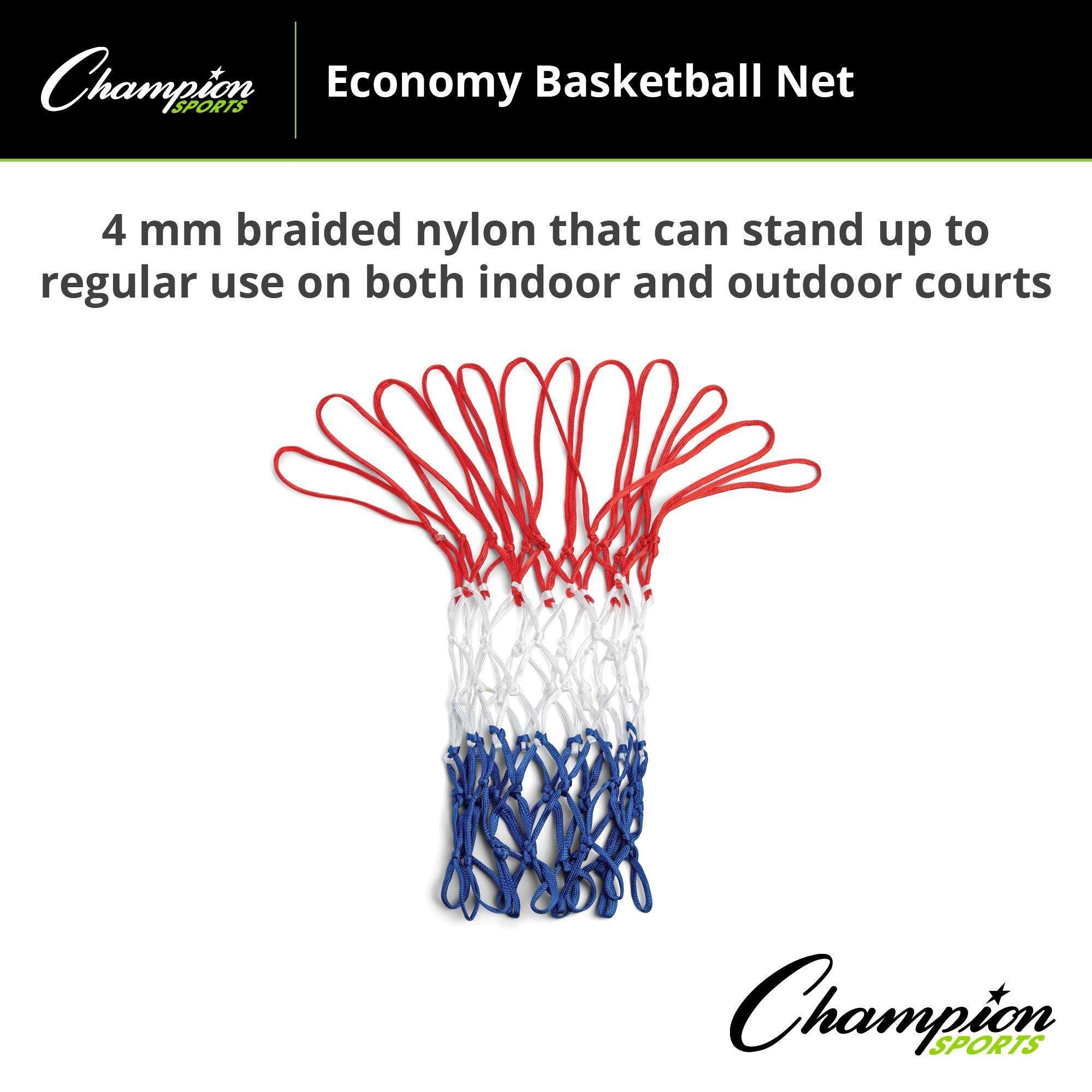 Shoot, slam, and dunk into The Champion Sports Multicolor Basketball Net. The net fits standard basketball rims and features a durable classic red, white, and blue braided nylon design that's suitable for indoor and outdoor use. The 4mm nylon fits most standard basketball rims.