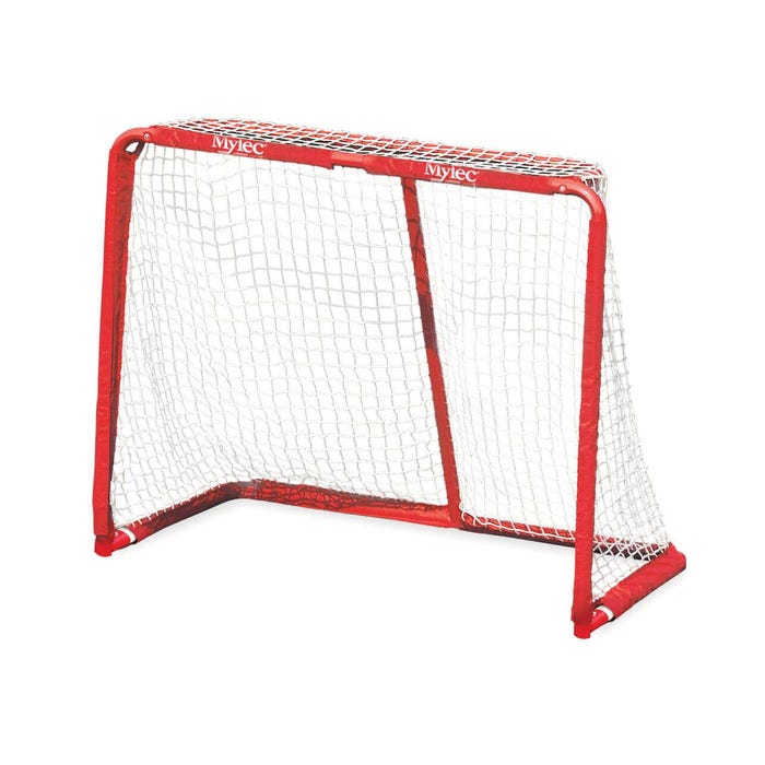 Mylec Pro Style Steel Goal measuring 54 x 44 x 30 inches with a 1-1/2 steel tubing, features a pro-style top shelf. Goal with professional-type styling and quality-construction has a center pipe support for additional strength that delivers superior playability. Goal red includes heavy-duty nylon pre-sleeved net. It can be set up a short span of time with the featured tough sleeve net system.Features