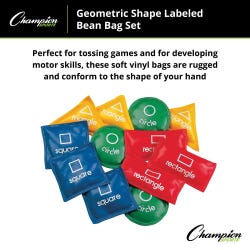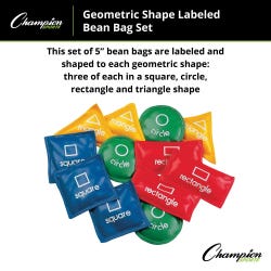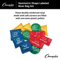 The Geometric Bean Bag Set from Champion Sports is great for early hands-on learning activities. The set features colorful, 5-inch bean bags are one of four shapes: rectangles (red), triangles (yellow), circles (green), or squares (blue). The bags have a double-reinforced vinyl cover filled with plastic beads. This set includes 3 red, 3 yellow, 3 blue, and 3 green bags.Features
