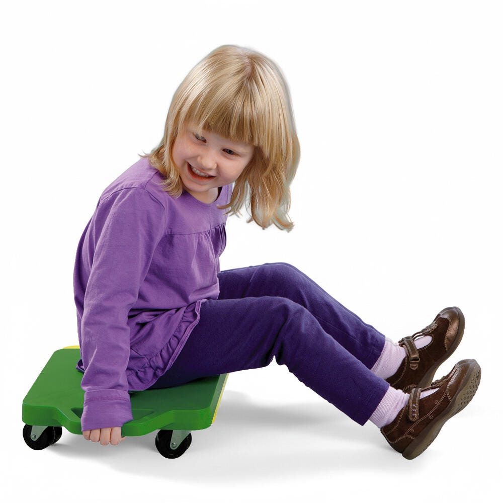 The FlagHouse Safety Grip Scooters keep the fun rolling and students safe! These safety-grip scooters are made of indestructible polypropylene with single-wheel non-hooded nylon casters. These premium casters exceed all ASA safety standards and are made to withstand hard, long-term use. This green scooter measures 12 x 12 inches and has a weight capacity of 175 pounds.