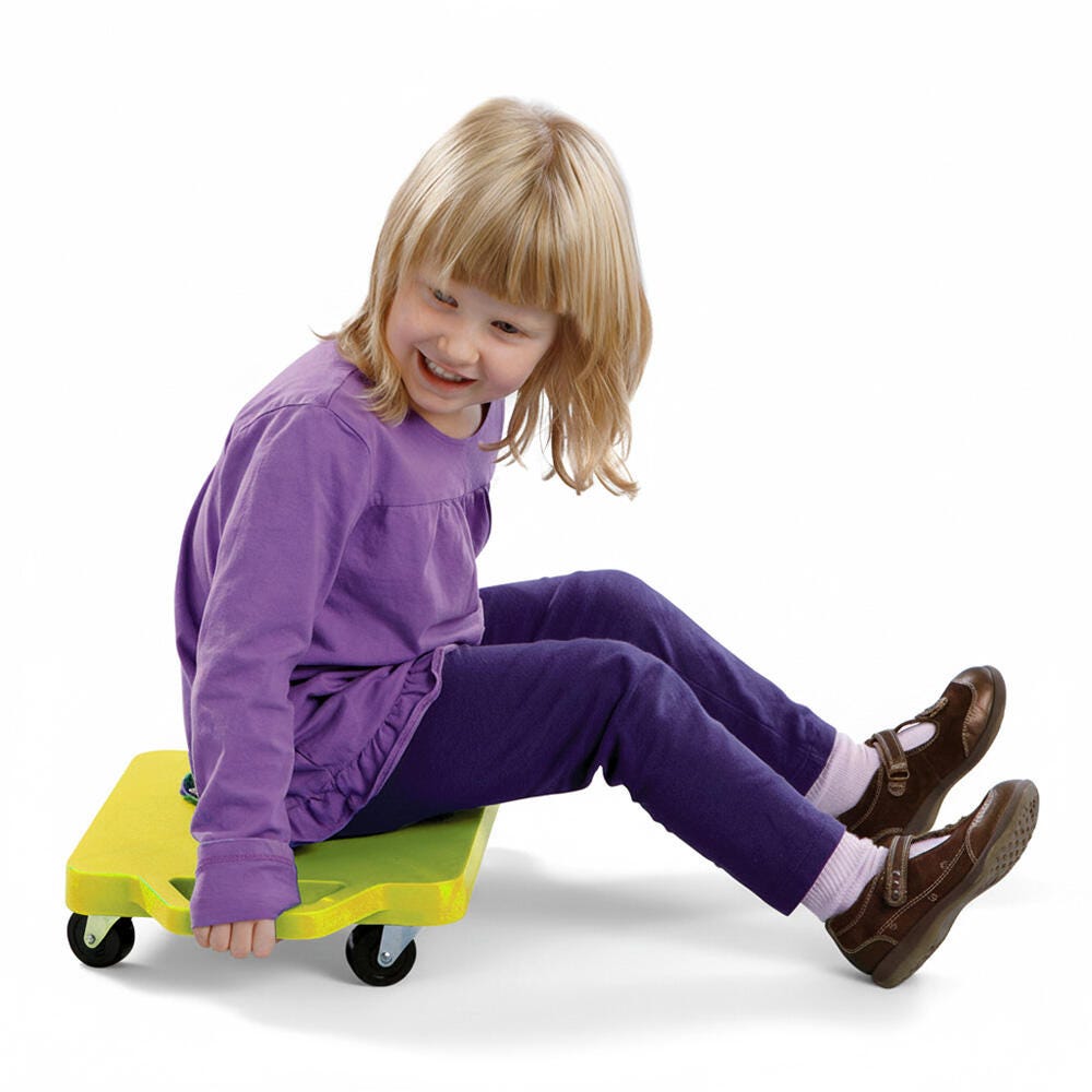 The FlagHouse Safety Grip Scooters keep the fun rolling and students safe! These safety-grip scooters are made of indestructible polypropylene with single-wheel non-hooded nylon casters. These premium casters exceed all ASA safety standards and are made to withstand hard, long-term use. This yellpw scooter measures 12 x 12 inches and has a weight capacity of 175 pounds.Features