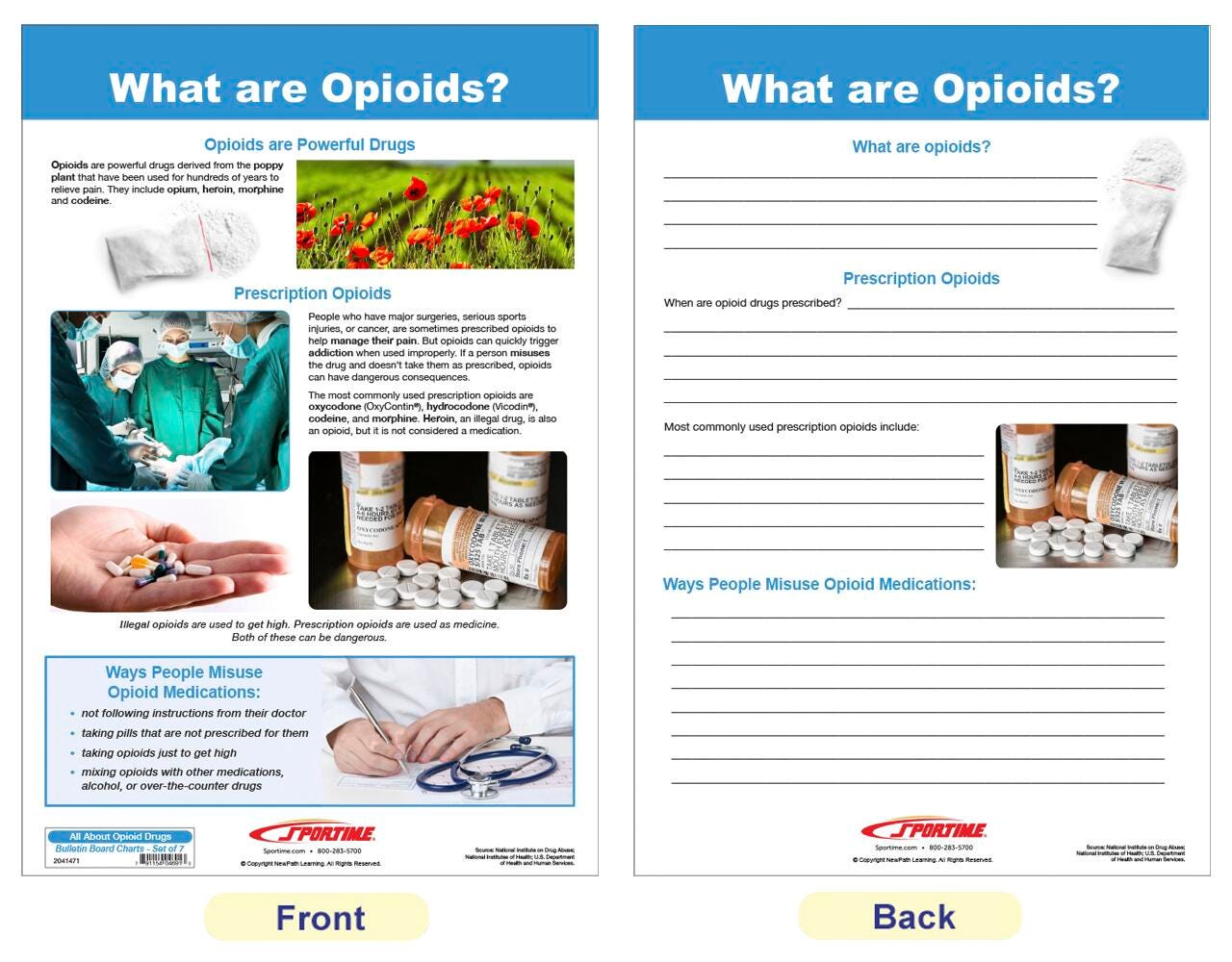 - The All About Opioids Bulletin Board Chart Set combines visually stimulating images, labeled graphics, easy-to-read text, glossary terms and hands-on “write-on/wipe-off” activities to complement a variety of student learning styles