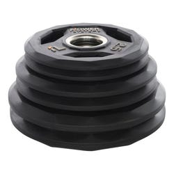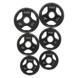 Unique beveled edges with designated gripping locations for easy pick up off of gym floors or using for exercises. Metal center ring for additional durability and easy transition on and off Olympic 2 inch diameter barbells. Black. Six sizes available, from 2-1/2 to 45 lbs, with the weights clearly marked in white. Sold individually - not in pairs.Features