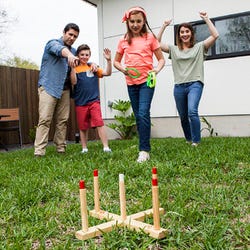 Designed for all ages, this classic game of ring toss helps improve hand-eye coordination, precision, and accuracy. This ring toss set is made of a solid wooden base with 5 rungs that are clearly labeled with scoring numbers. The four non-abrasive plastic rings are easy to hold and throw. Set up is quick and easy with the included carrying case.Features
