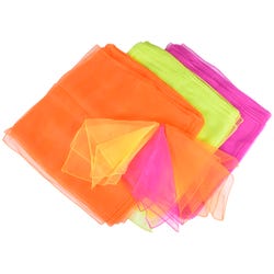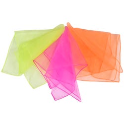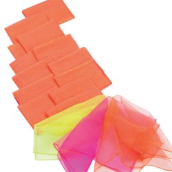 Juggling Scarves are a great way for you to teach juggling at every age. Juggling is an important part of virtually every comprehensive elementary physical education program, because it teaches focus and hand eye coordination. Hemmed Nylon scarves measuring 17 x 17 inches. Set includes 108 Juggling Scarves with 36 in each color: Neon Yellow, Neon Orange and Neon Pink.Features