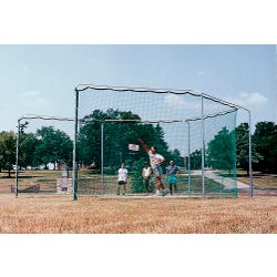 This Pro-Down Discus Cage With Ground Plates features six 11 feet high (3.3m) galvanized steel upright posts that are angled at the top for added protection. The surrounding net is constructed from 200 pound. test, 1-3/4 inches (4.4cm) weather-treated nylon mesh. The top of the net has grommets every 24 inches (60cm) with special, easy clip-on hanging hooks. A replacement net with the same construction specifications is available separately. Meets all NFHS specifications. Search Pro-Down Discus Cages for more options.