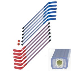 Shield LTG Outdoor Middle School Floor Hockey Stick Set features 42 inch hockey sticks, featuring a light-weight reinforcing fiberglass tube shaft. Set includes 12 hockey sticks (6 Red, 6 Blue) and 2 speed control balls.Includes: (6) Black and (6) White 42 in Sticks and (2) Speed Control Balls
