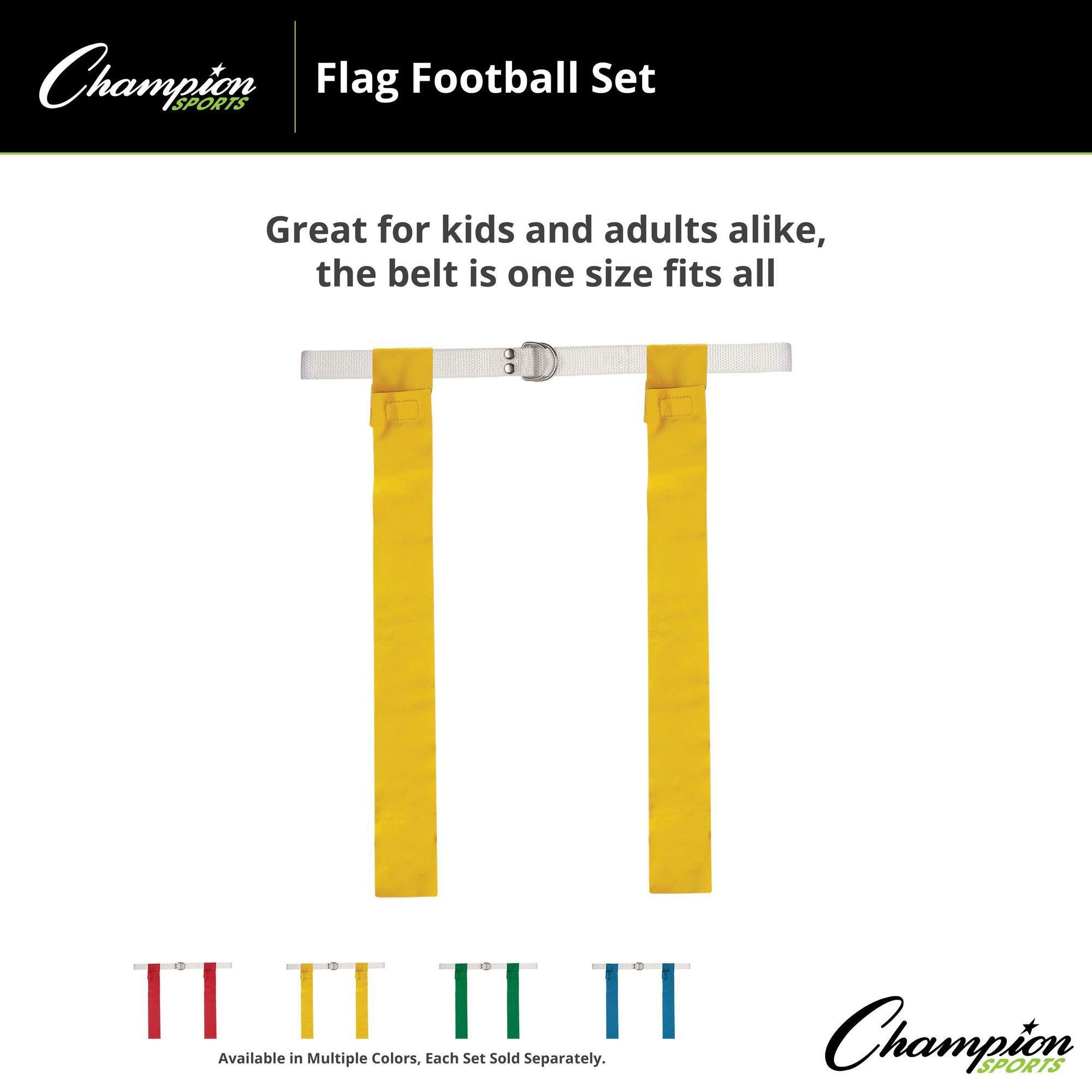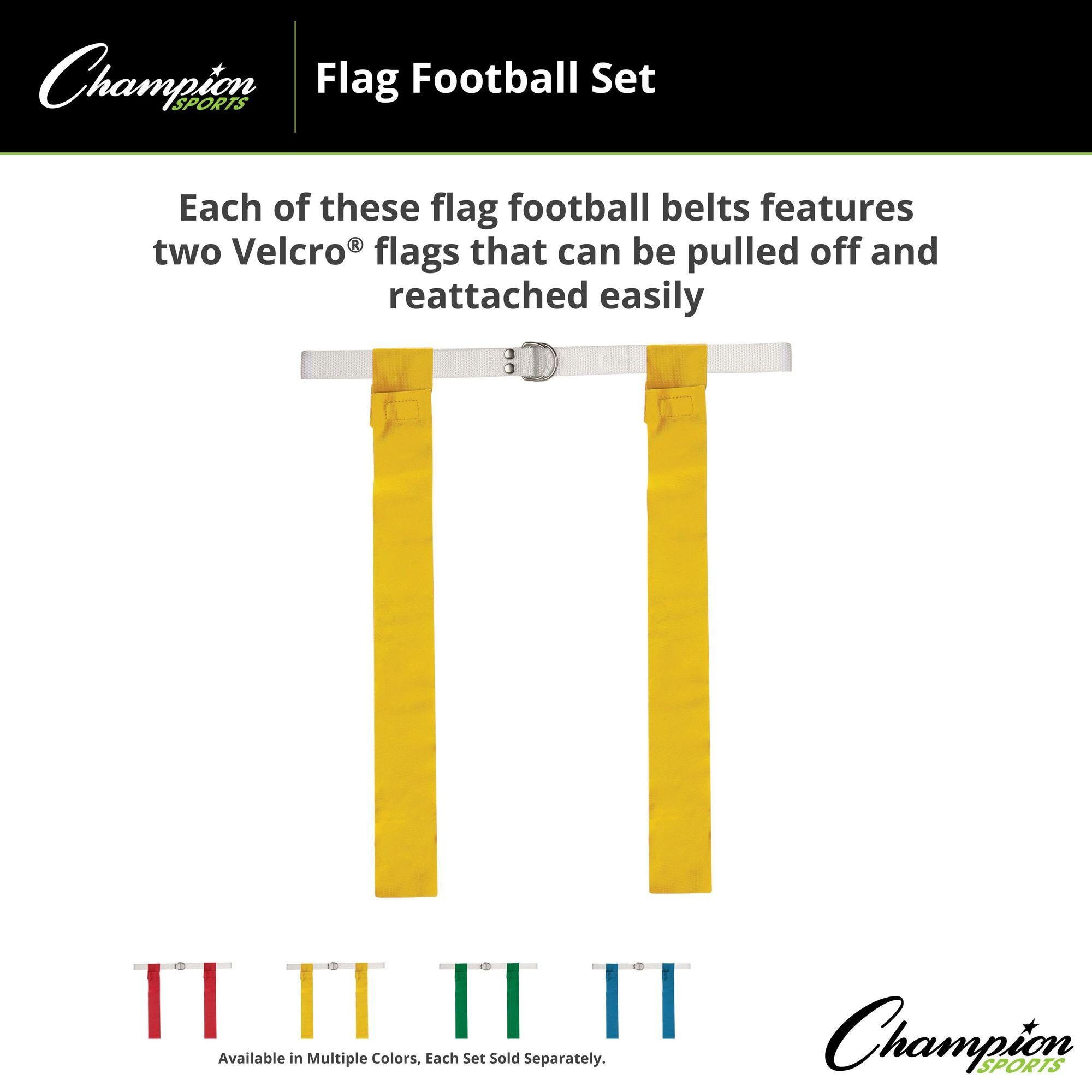 Get all the excitement of a football game without the danger of tackling with this set of Flag Football Belts from Champion Sports. Great for children and adults alike, the adjustable belt is one size fits all. Each belt features two yellow hook and loop flags are easy to attach and pull off. Each belt measures 1 inch wide and 60 inches long. This set contains 12 belts with 2 flags each.Features
