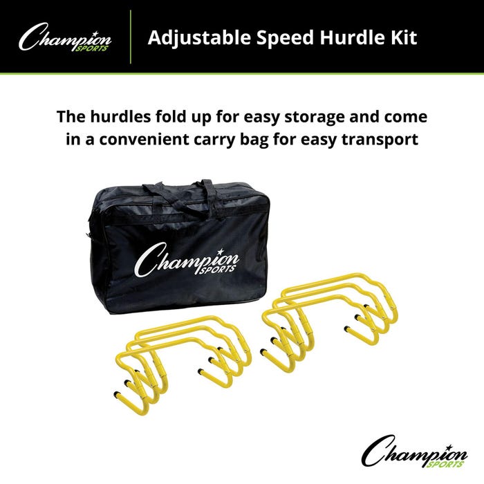 The Adjustable Hurdle Kit from Champion Sports is a versatile training tool for athletes of all ages and disciplines. This kit includes six hurdles that can be adjusted from 9 to 12 inches high by rotating the base of the hurdles. Plus, they fold up for easy storage and come in a convenient carrying bag.