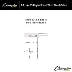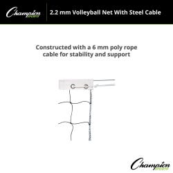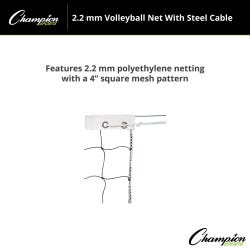 This Champion Sports Volleyball Net offers enhanced support and durable materials for competitions and casual games. The net measures 32L x 3 H feet, with 2.2mm twisted polyethylene netting in 4-inch squares, a 2-1/2-inch taped headband, and a rope cable that ensures the net maintains its shape.Features