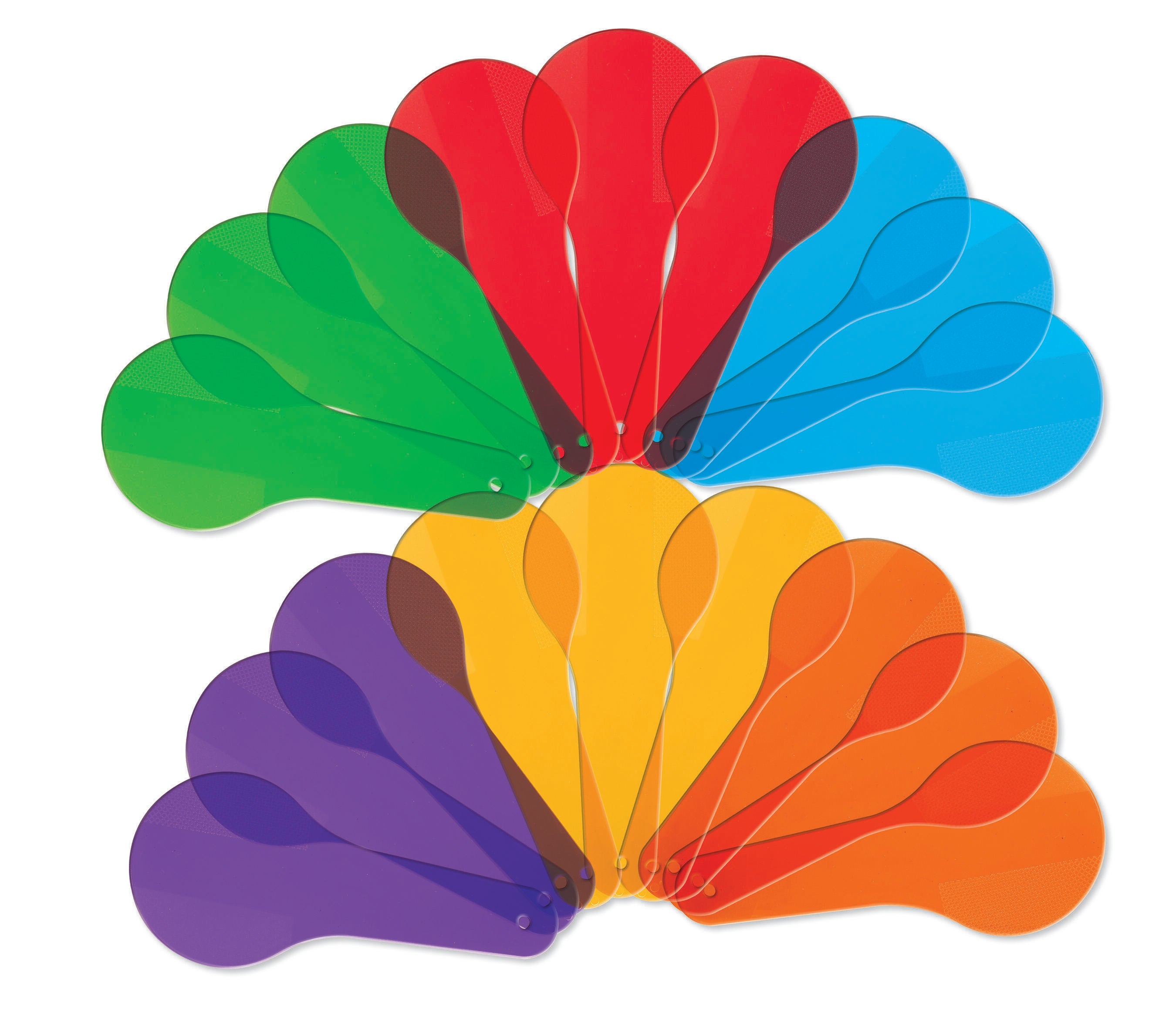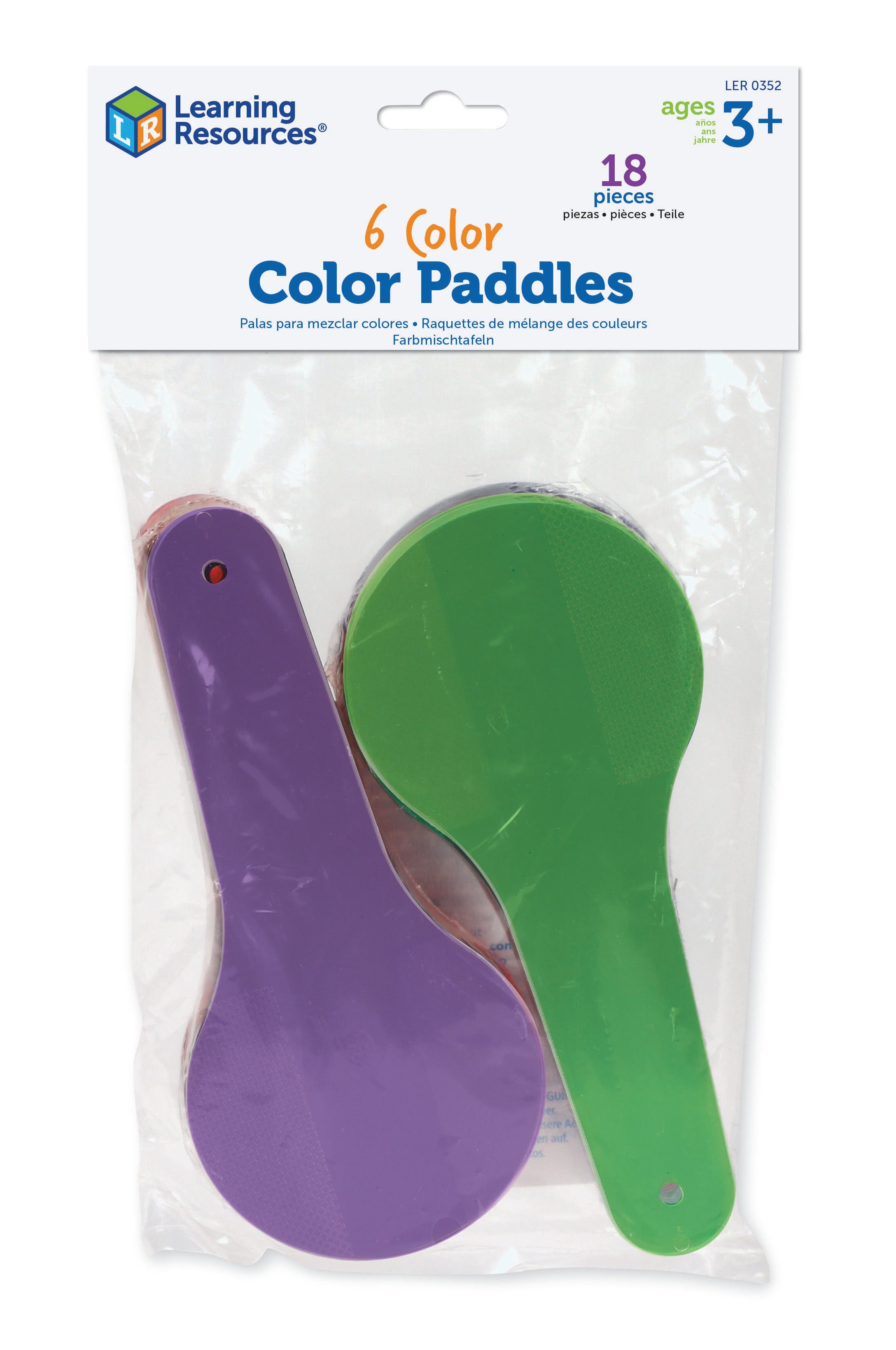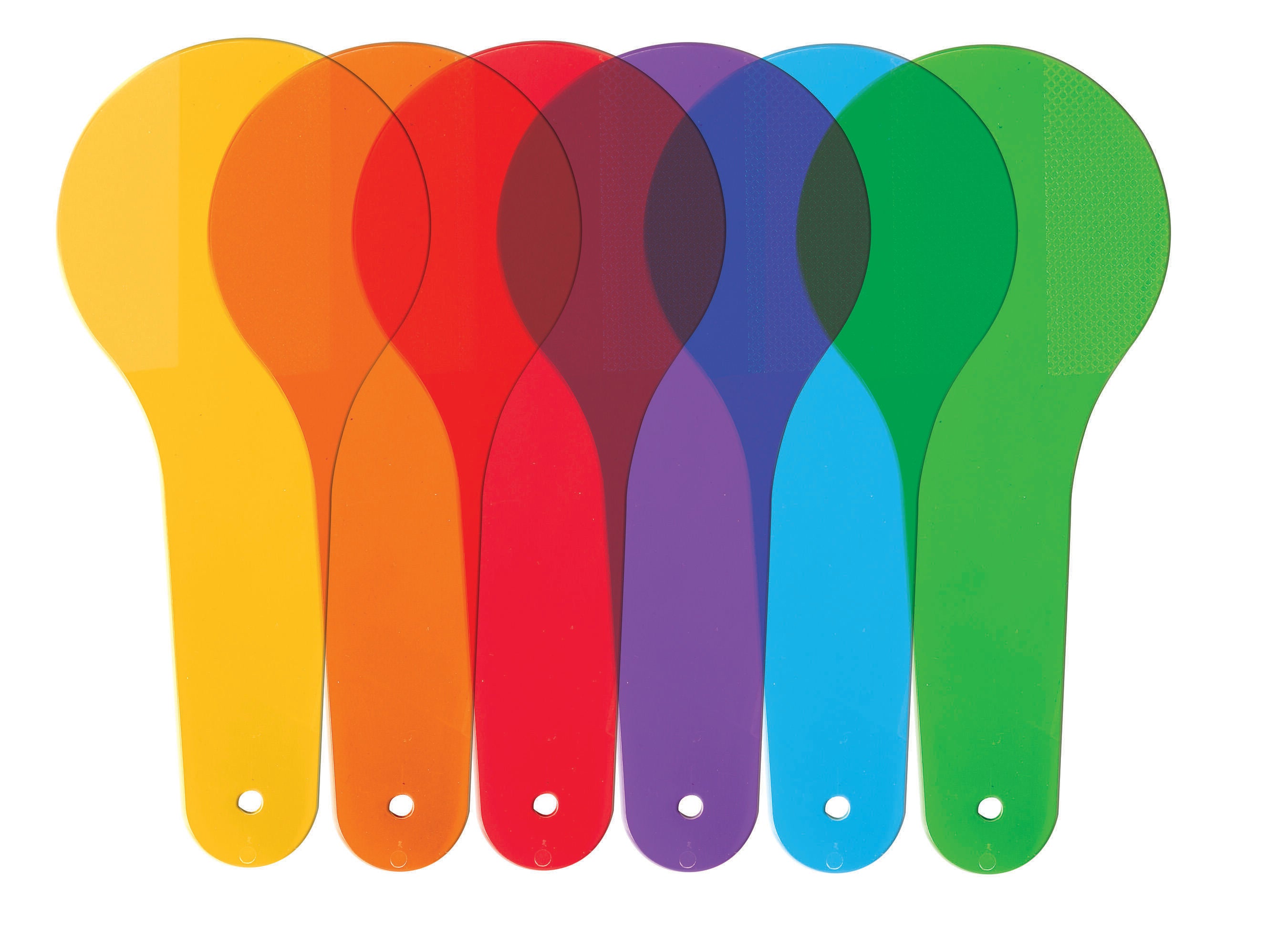 Transparent Color Textured Paddle Set includes 18 paddles that are 6 inches long. They are ideal for explaining the principles of color and color mixing. Ages 3 and up.