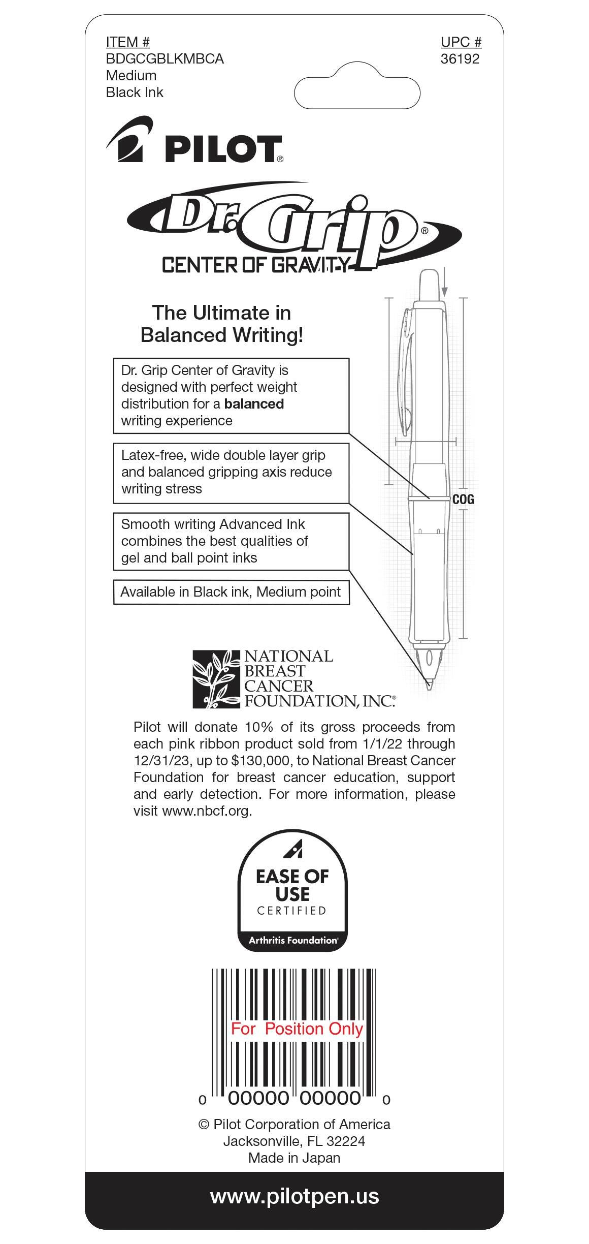 Pilot is now partnering with the National Breast Cancer Foundation* on a pink ribbon Dr. Grip Center of Gravity pen benefitting Breast Cancer Awareness and Research! Only Dr. Grip Center of Gravity has Pilot's smooth writing ballpoint ink, unique double layer comfortable rubber grip, and specially balanced barrel designed to reduce writing stress. Let Dr. Grip fill your prescription writing comfort with a great pen for a greater cause.*Pilot will donate 10% of its gross proceeds from each pink ribbon product sold from 1/1/22 through 12/31/23, up to $130,000, to National Breast Cancer Foundation for breast cancer education, support and early detection. For more information, please visit www.nbc.org