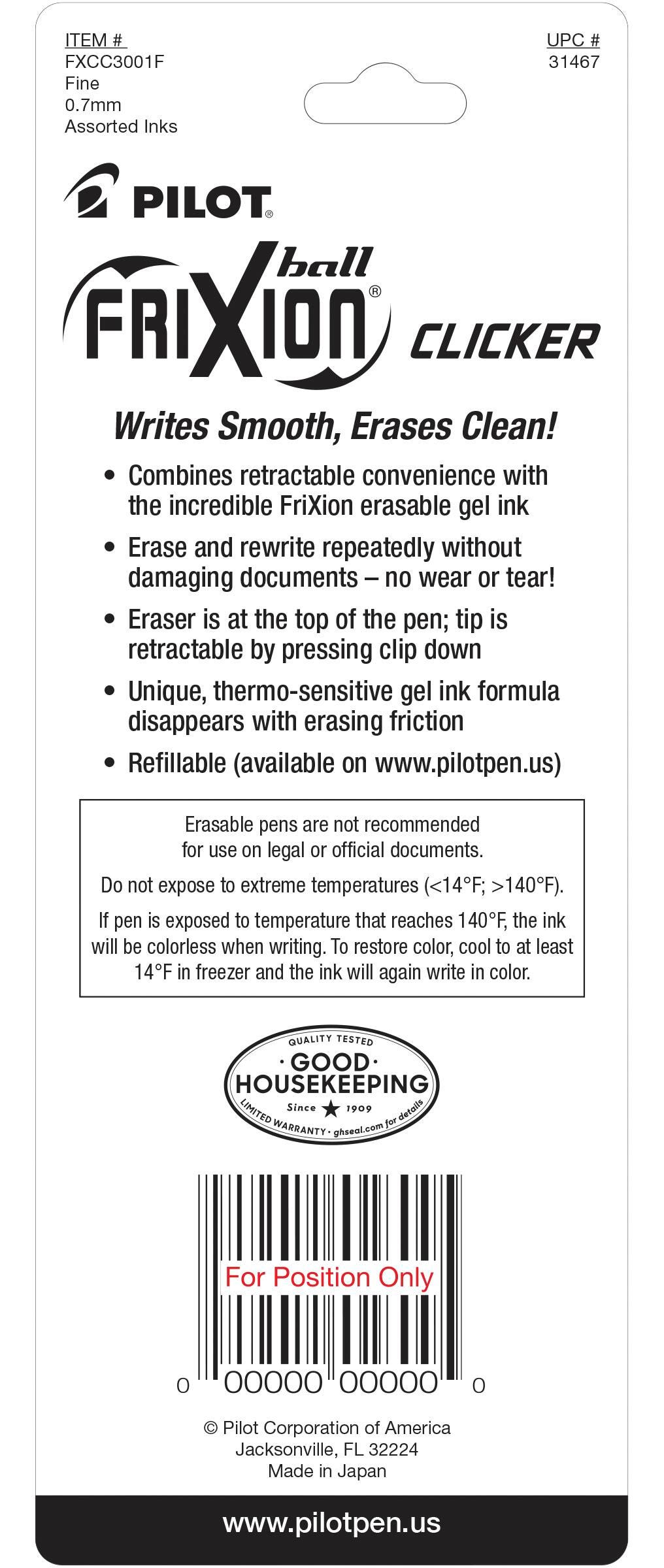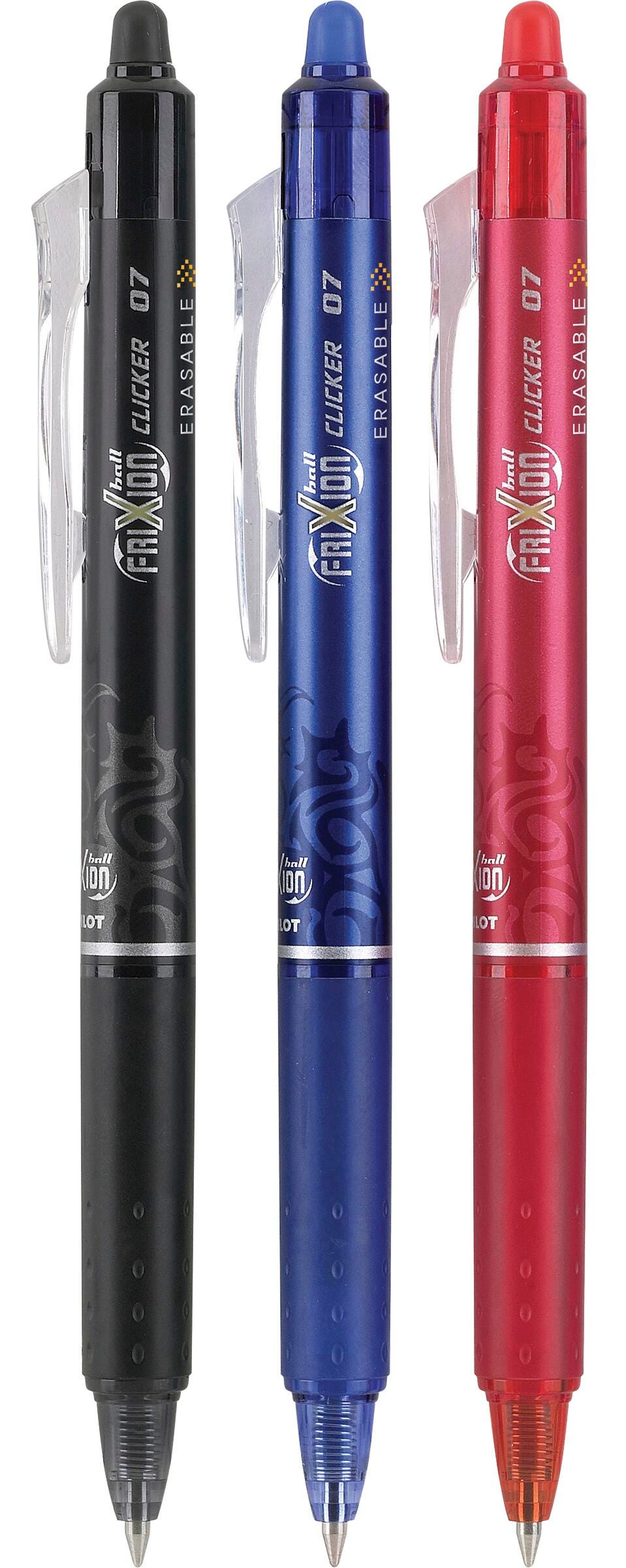Never write a mistake again. . . guaranteed! Pilot FriXion Clicker is America’s first retractable, erasable gel ink pen that allows you to write, erase, and rewrite repeatedly without damaging documents. FriXion’s unique thermo-sensitive ink is formulated to deliver both vibrant color and smooth writing. Pilot's FriXion Clicker is refillable and comes with a retractable clip and comfortable grip. Great for editing, lists, scheduling and so much more, Pilot FriXion pens make writing stress-free and mistake-free.Features