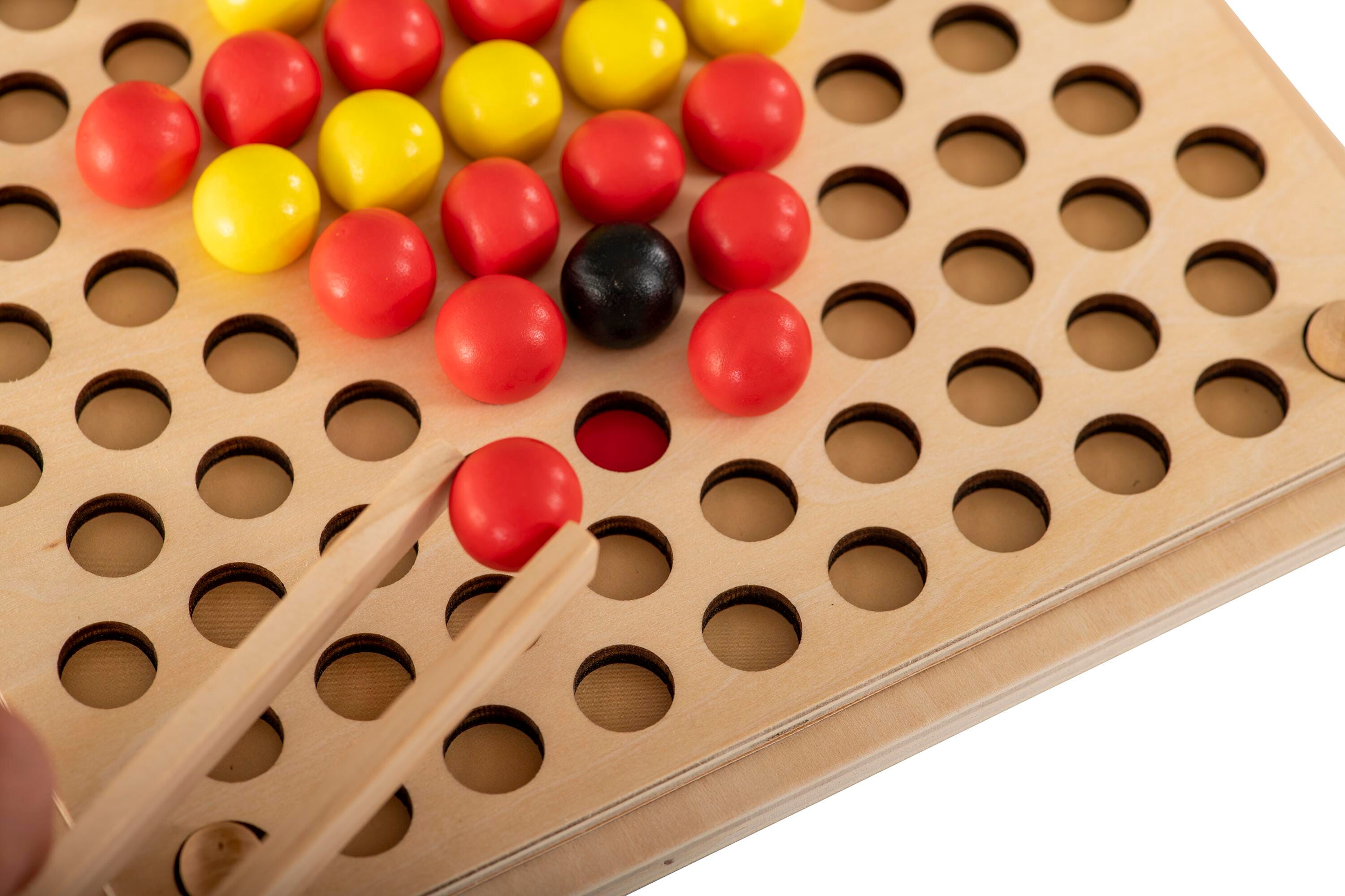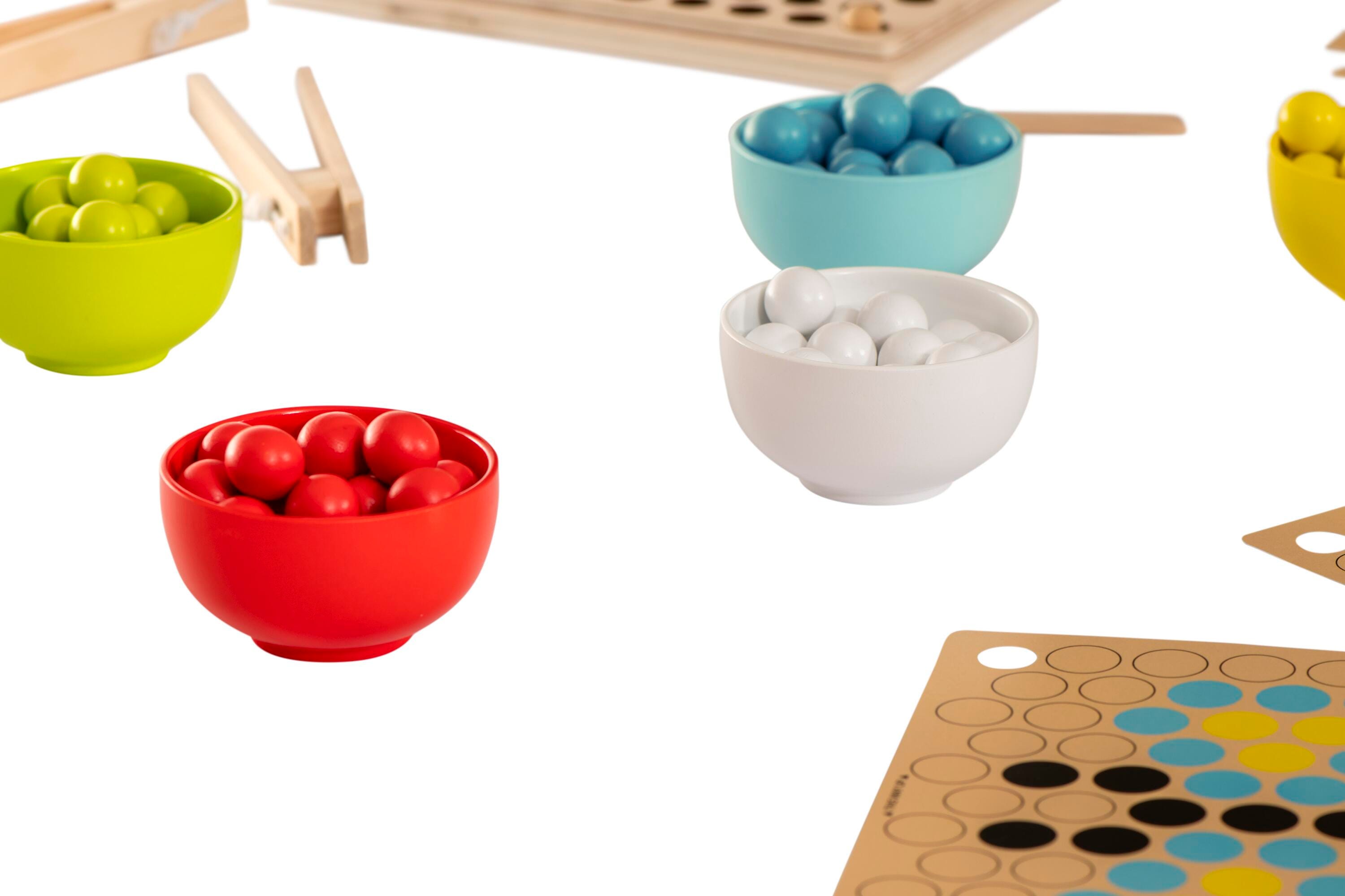 This set is ideal for promoting fine motor skills, color recognition, sorting, and cognitive development skills. Children take a card, place it on the baseboard, add the overlay and then place the balls onto the board to match the pattern using the tweezers or the spoon. The 10 double-sided work cards feature a range of designs that allow children to create pictures that include a dolphin, a parrot, a star, and many more. As well as using the 10 double-sided work cards, the children can also create their own designs and patterns. Children will also love to sort the balls into the bowls. The baseboard measures 8.3 x 8.3 inches. Crafted from FSC-certified pine wood, plywood, and schima superba.Features