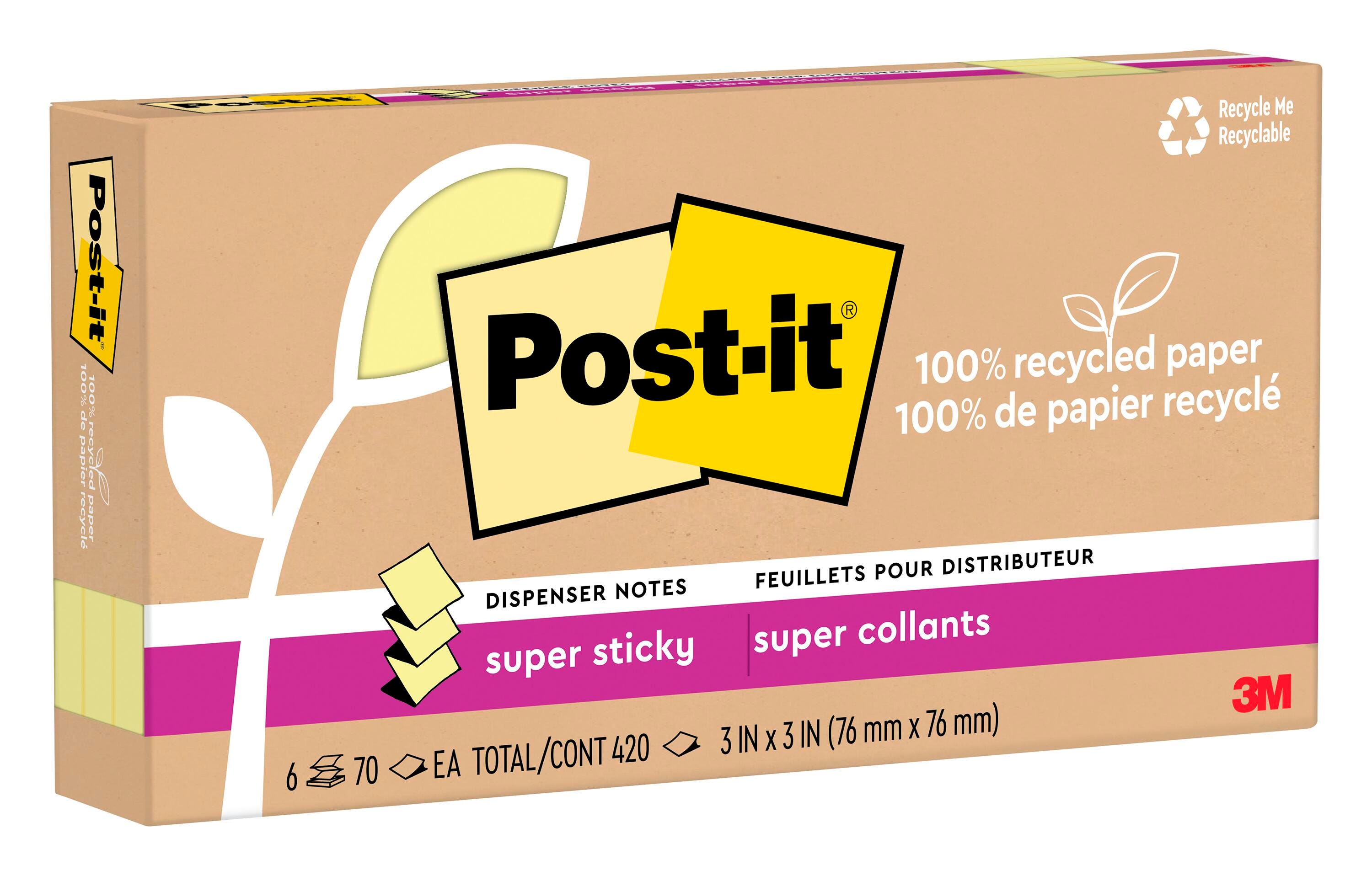 Post-it® 100% Recycled Super Sticky Dispenser Notes, Canary, 3x3 Inches, 6 Pack, 70 Sheets per Pad,