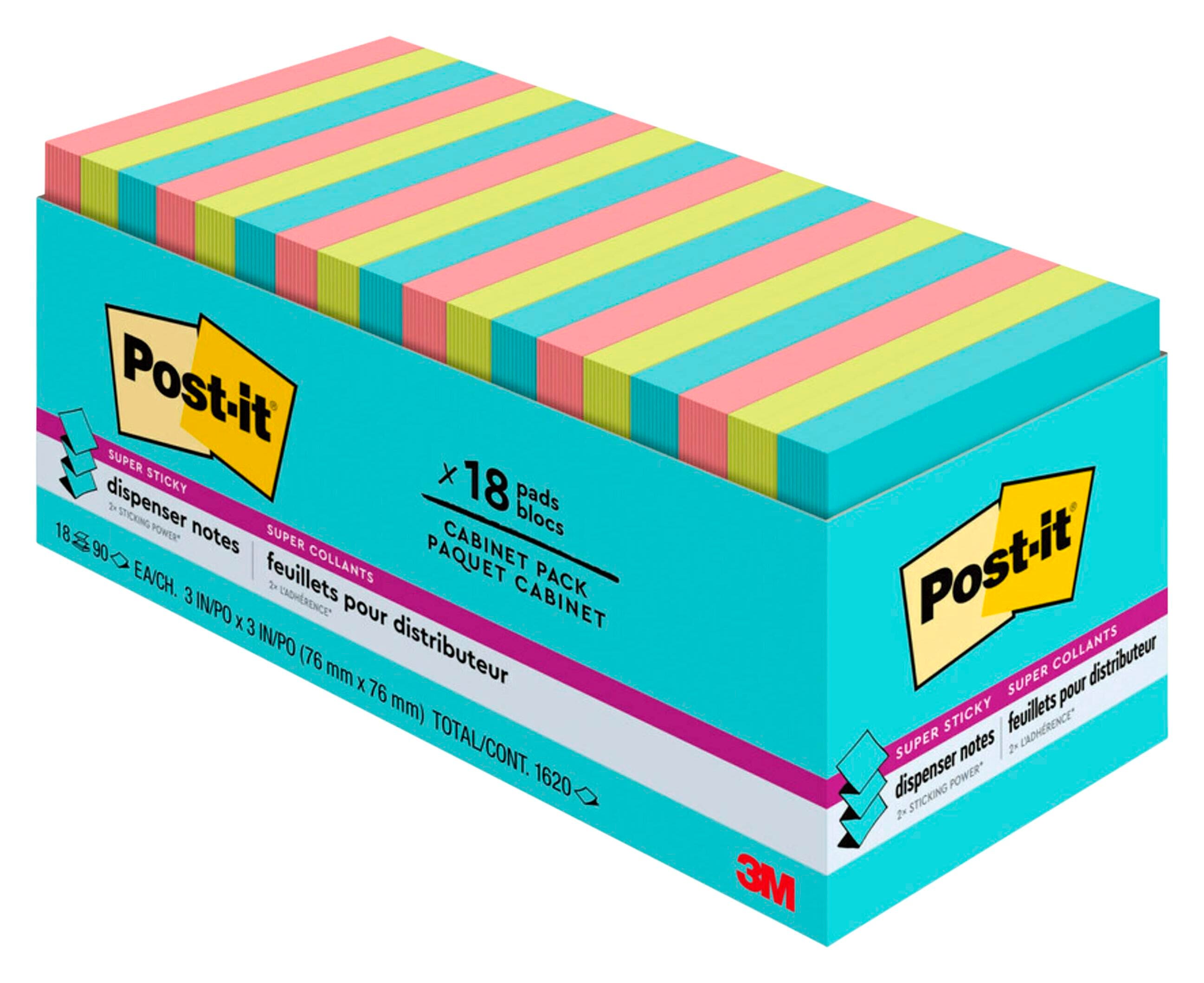 Post-it Super Sticky Pop-up Notes come in a convenient cabinet pack to keep notes neat and organized. They pop up one at time from dispensers for easy one-handed dispensing. Super Sticky adhesive holds stronger and longer yet removes cleanly. Notes stick practically anywhere. Unique adhesive technology ensures your notes will stick securely to more surfaces. Stick your notes where they will really get noticed like doors, monitors and walls. The recyclable paper in Post-it Notes is sourced from certified, renewable and responsibly managed forests. Each pad includes 90 sheets.