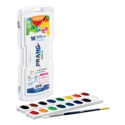 Prang Semi-Moist Watercolor Paint Set features choice pigments blended with specially formulated binders to offer a superior and truly brilliant transparency. Oval pan set of Non-Toxic watercolors comes with a brush and plastic case having a hinged mixing lid. Set contains 16 assorted watercolors that includes red, yellow, blue, green, orange, violet, brown, black, turquoise blue, red-orange, yellow-orange, blue-green, blue-violet, red-violet, yellow-green and white colors. Refillable with Prang Oval Pan refills (sold separately).Features