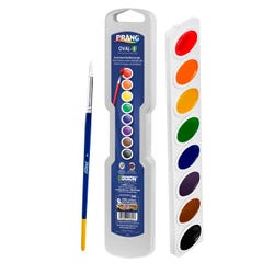 Prang Semi-Moist Watercolor Paint Set contains 8 assorted colors that includes red, yellow, blue, green, orange, violet, brown and black. Oval pan set features choice pigments blended with specially formulated binders to offer a superior and truly brilliant transparency. Non-Toxic watercolor comes with plastic case having a hinged mixing lid and includes a brush. Refillable with Prang Oval Pan refills (sold separately).Features