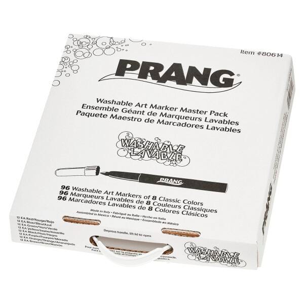 Prang Washable Art Marker Set permits for a 24 hrs cap off time before drying takes place. Set comes with 96 markers with colors like red, green, blue, purple, yellow, orange, brown and black. Bold Non-Toxic marker ink set features ink that doesn't bleed through paper and durable bullet tip holds up to regular use. Marker set has washable formula that removes easily from skin and many fabrics.Features