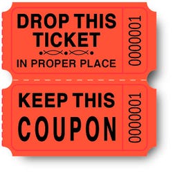 School Specialty Double Roll Tickets preprinted with the message, "Ticket" on one half and "Keep this Coupon" on the other help to check admission to events. Each ticket has the same number preprinted on both halves for trouble-free tracking. Consecutively numbered tickets come in a roll for convenient use. Roll comes with a writing space for mentioning name as well as address. Pack of 2000. 2 x 2 inches. Red.