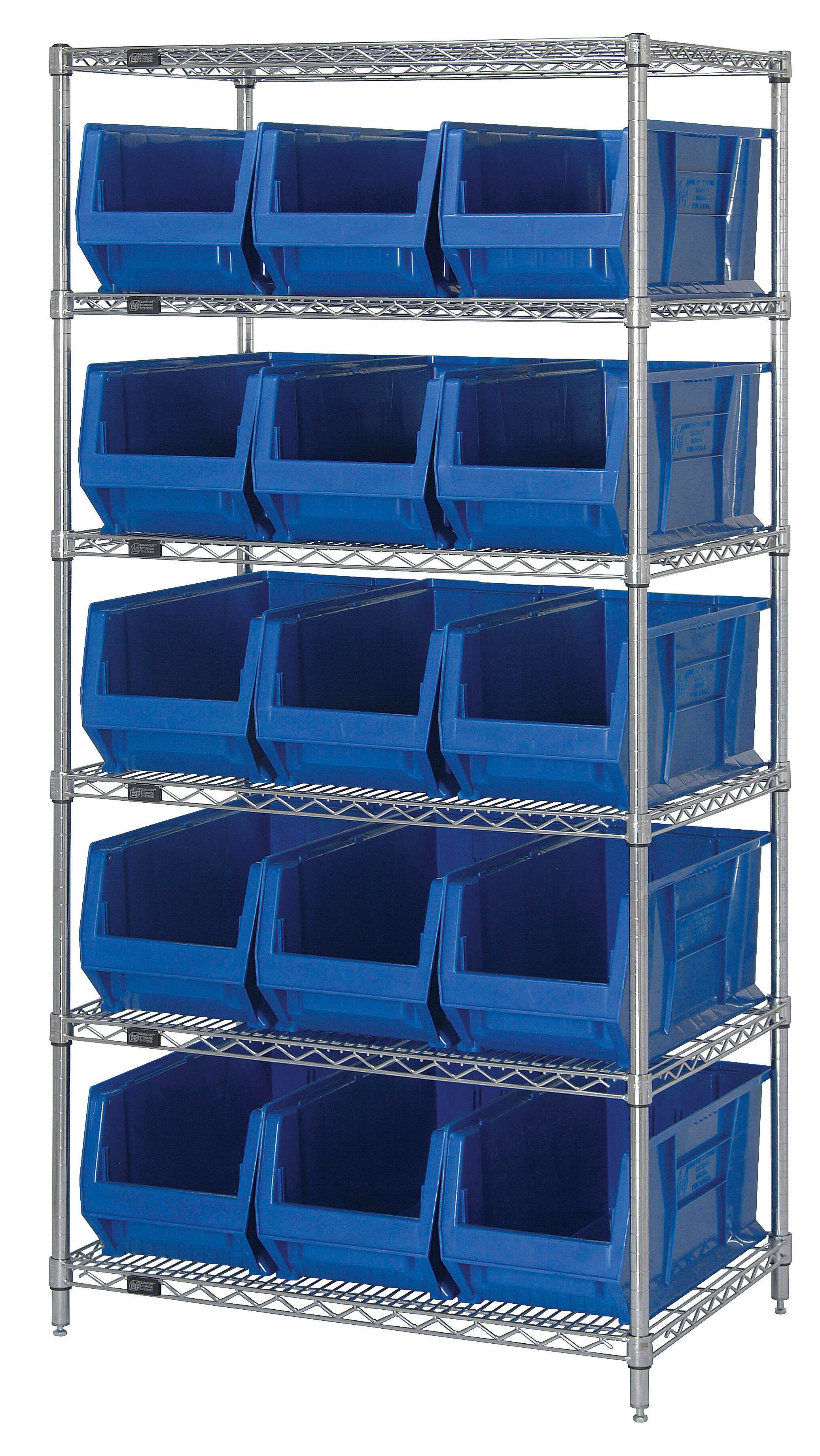 The economical, high density bin storage system includes heavy-duty stack bins with open hopper fronts for easy access. Chrome finish wire shelving has an 800-pound capacity per shelf. The shelving unit has 6 shelves total and measures 36 W x 24 D x 74 H inches.Features