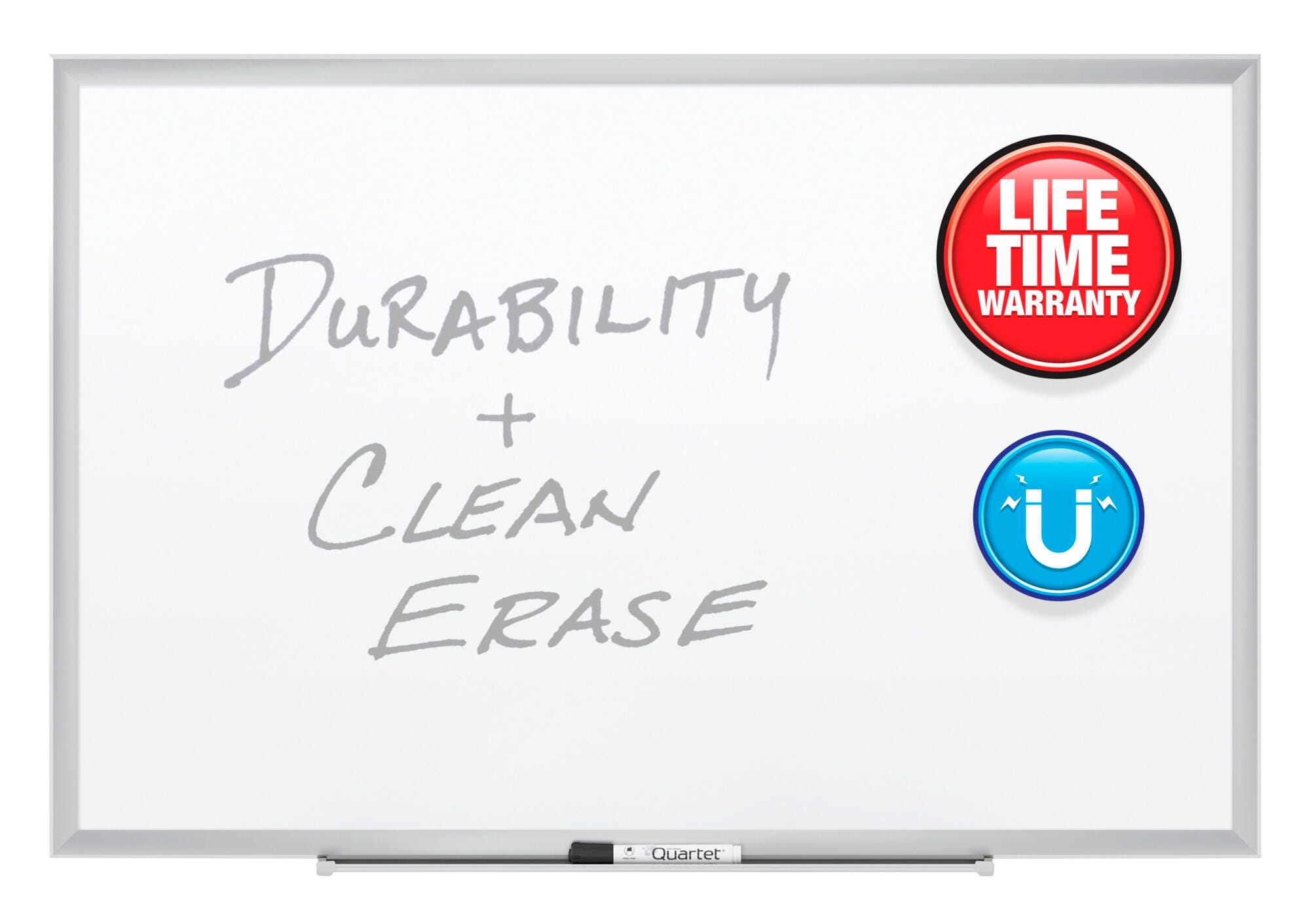 Built to last, porcelain marker board features a magnetic surface that will not stain or ghost and a satin finish anodized frame. Durable porcelain will not scratch or dent with heavy use. Mounting system makes hanging simple and allows horizontal or vertical positioning. Marker tray can be attached with horizontal installation only. Marker board includes four Quartet dry-erase markers. Writing surface measures 8 W x 4 H feet.