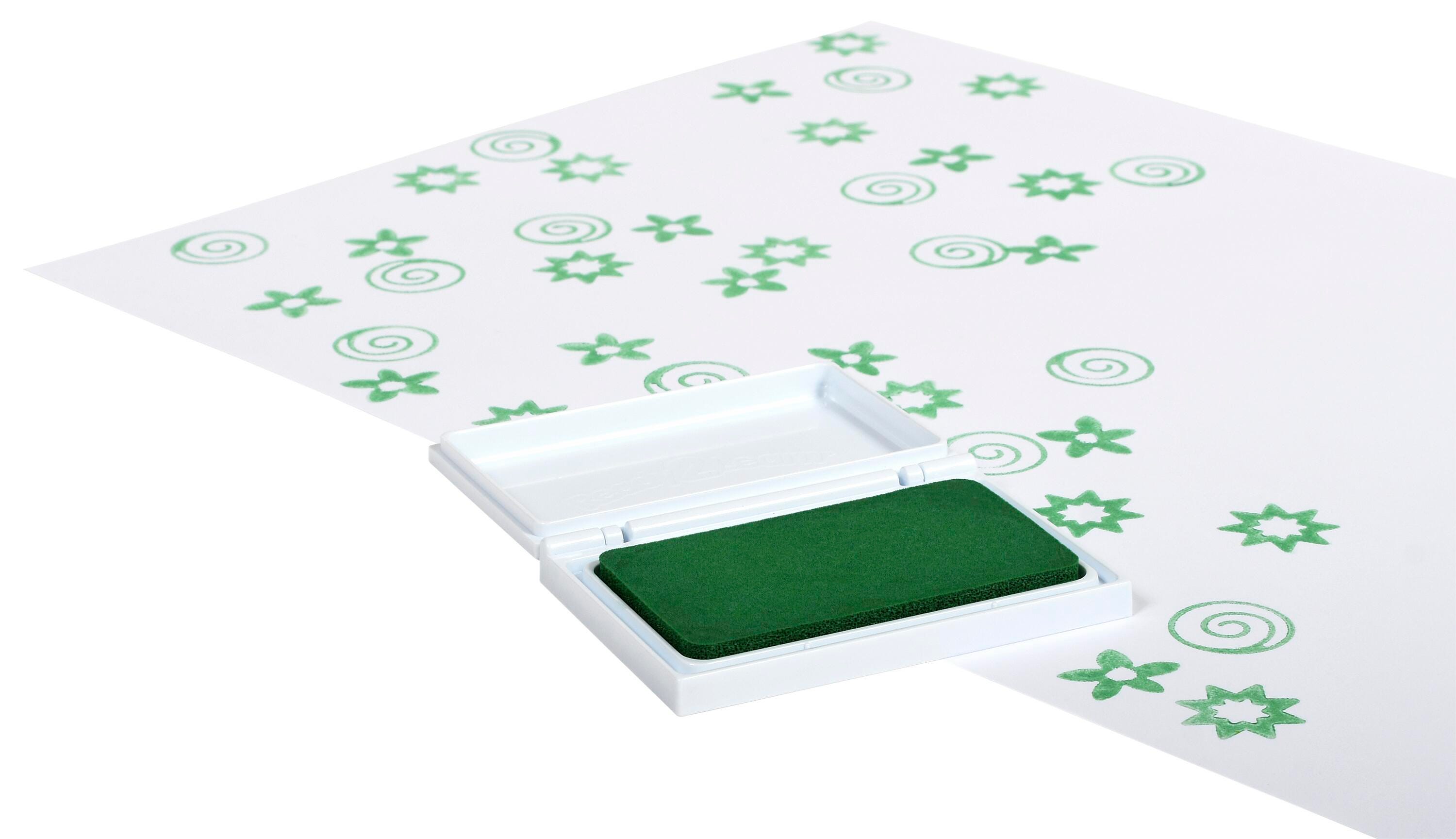 This green stamp pad is fade-resistant and acid-free for archival quality. The raised pad means there are no hard edges around the ink. Children can press down without hitting an edge, which provides more area for stamping. Stamping is a fun way to develop fine motor skills and foster creative expression. The ink pad is packaged in a plastic case with a flip cover to prevent it from drying out. For ages 3+ years. Size of entire stamp pad (with plastic casing): 3-7/8 x 2-3/4 x 5/8 inches; Size of ink pad: 3-3/8 x 2 inches.