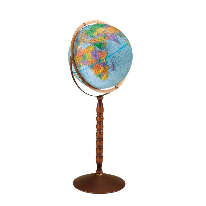 Replogle Floor Standing World Globe measuring 12 in is featured with durable metal base and a gyro-matic mounting offering a great look. Full swing meridian takes this beautiful globe to the next level, making it not only dynamic and functional but also a striking work of art. It permits you to easily transform the globe from a full 32 in tall model to a smaller tabletop model with just a few simple maneuvers. Perfect for any home or office, the palette works well with any decor and is an excellent complement to almost all surroundings.Features
