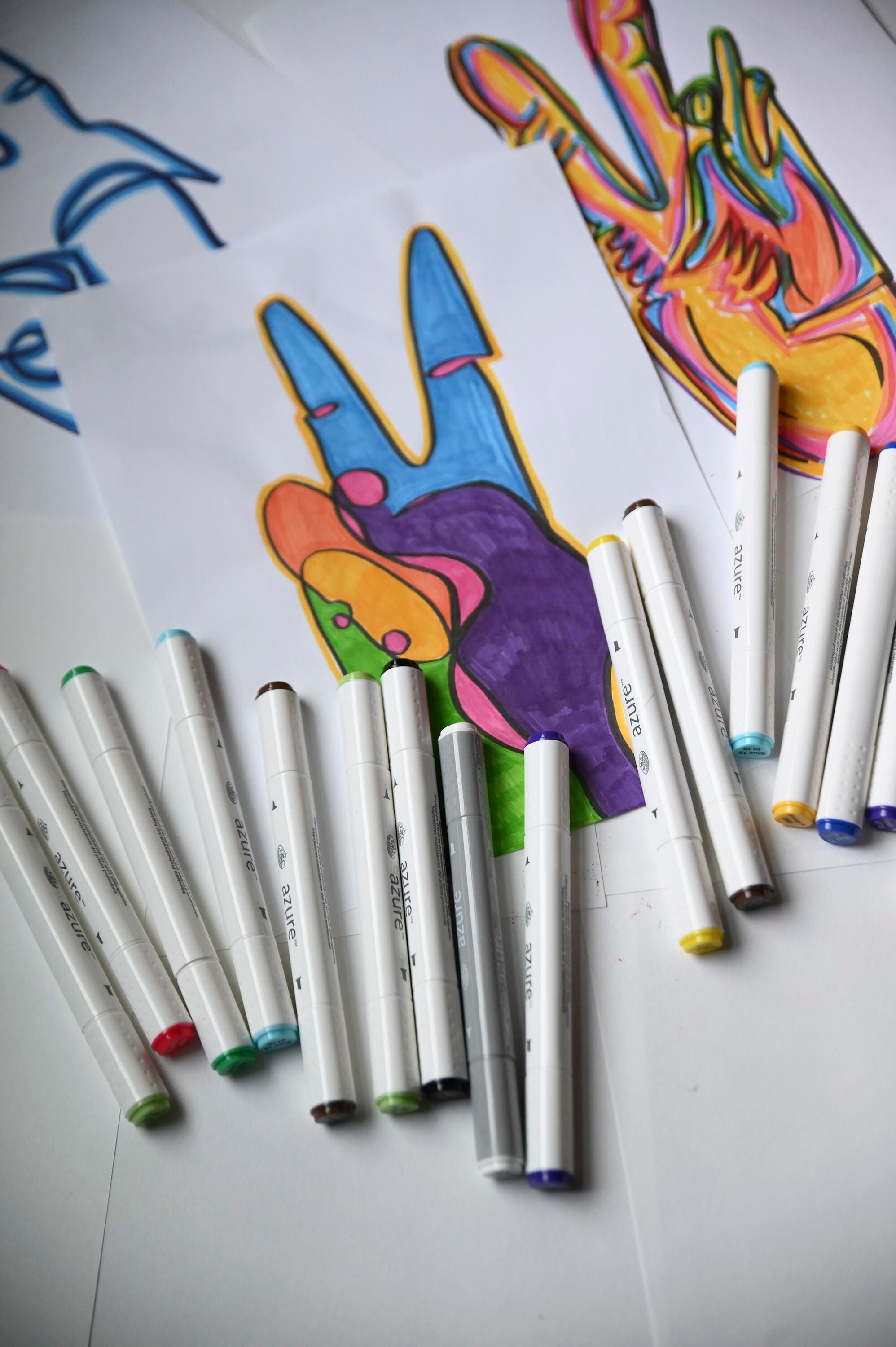 These dual-tip premium quality alcohol-based markers feature a fine round point for intricate illustrations and chisel tip for broad and thicker lines. Each color is vibrant for smooth lay down and easy to blend. Affordable quality markers with a triangular barrel for ergonomic fit. CL Conforms to ASTM D-4236. Six sets of 13 markers each.