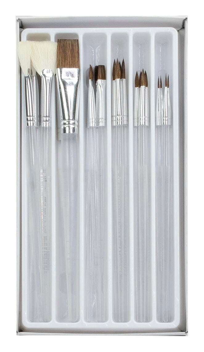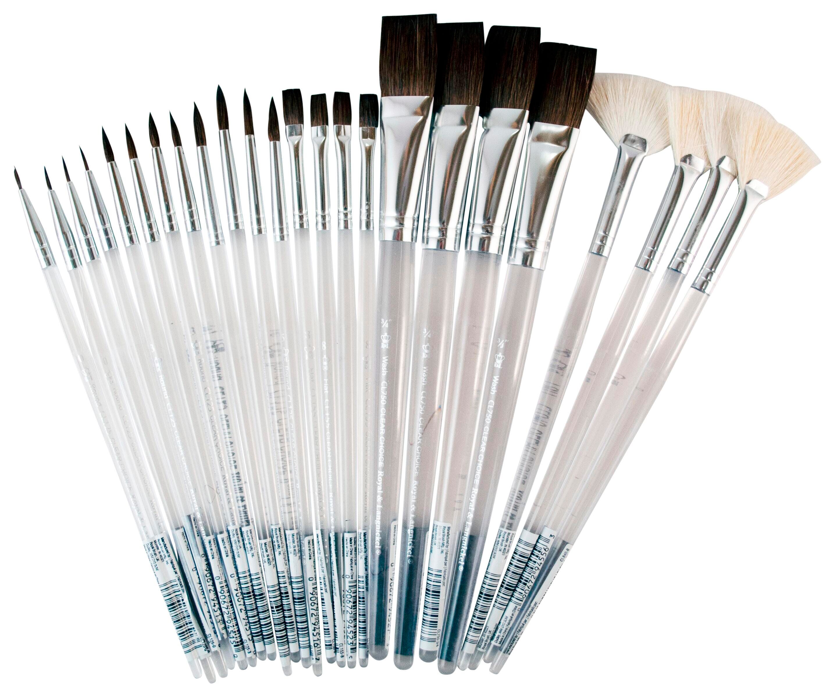 This assortment of 24 Clear Choice brushes have standard acrylic handles that won't chip or peel and are constructed with soft natural hair. Ideal for ceramic finishes and glazes, this assorted paint brush set contains 4 each of Size 0 round brushes, Size 3 round brushes, Size 5 round brushes, Size 8 flat brushes, 3/4 inch glaze brushes, and Size 8 fan brushes.Features