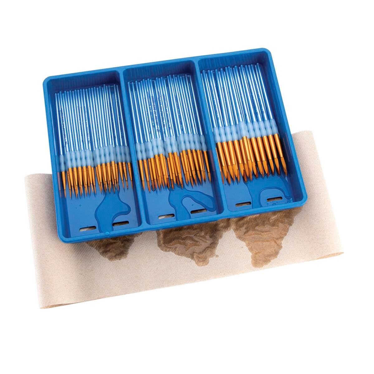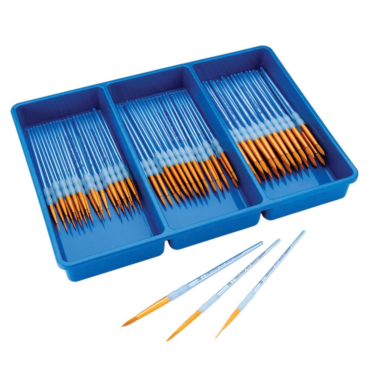 Royal Brush Scholastic Choice Gold Taklon Round Set of 72 includes 24 each 3, 6 as well as 8 rounds. Round brush set is primarily designed for the classroom purpose. Set of brushes are made with polymer handles that won't crack or peel when left in water and have gold taklon hair for long lasting durability. It works well with most water-based products such as watercolor, acrylic, tempera, ceramic finishes and much more.