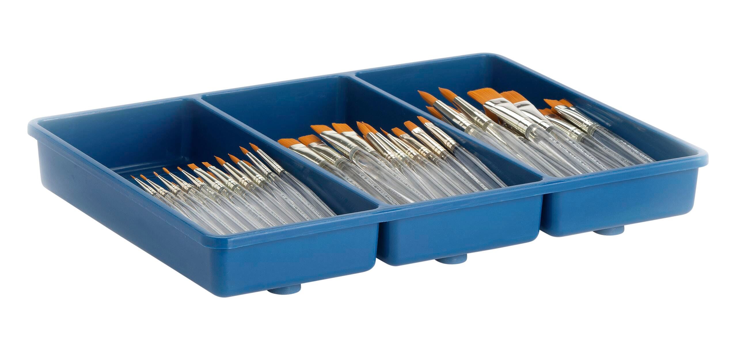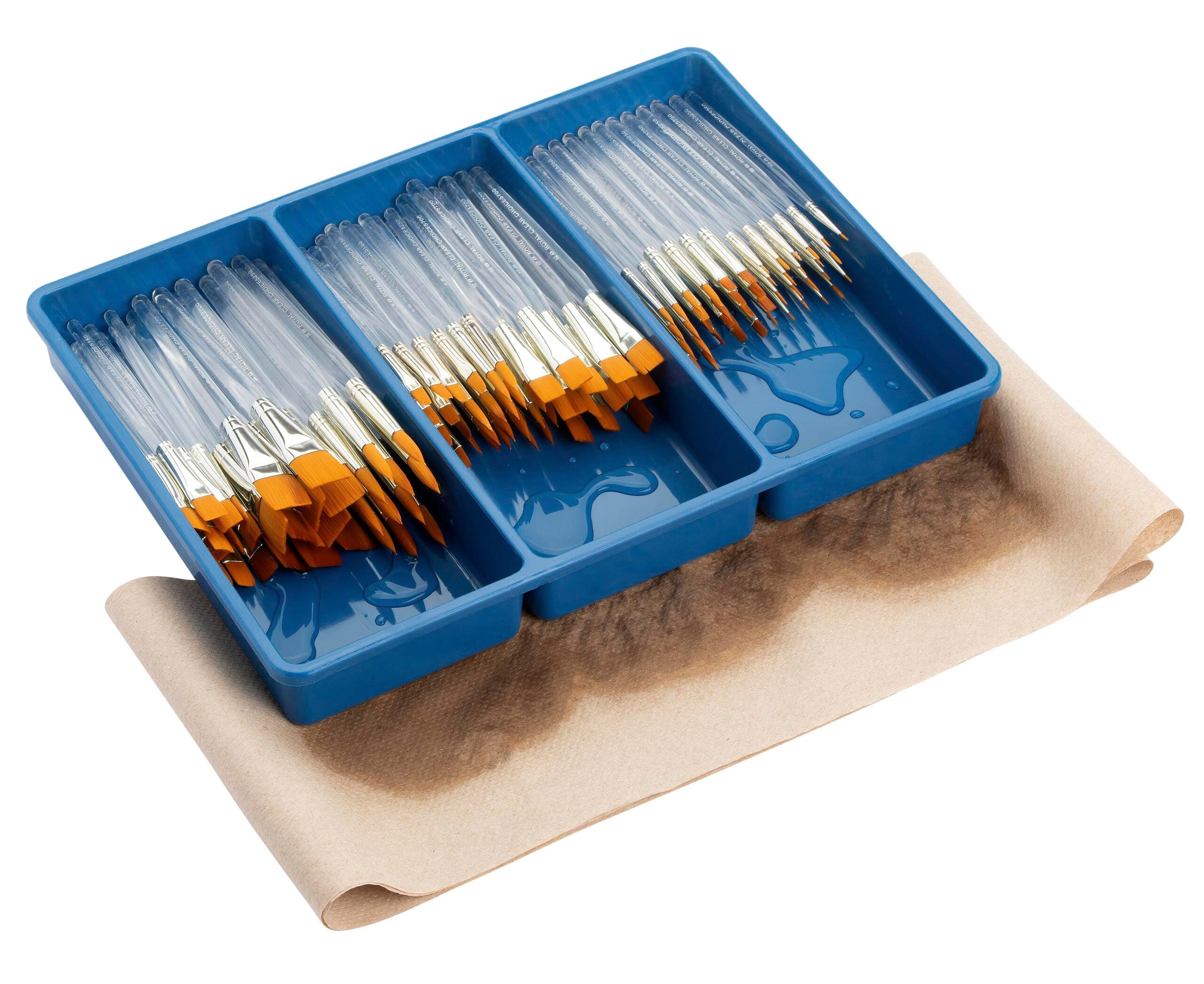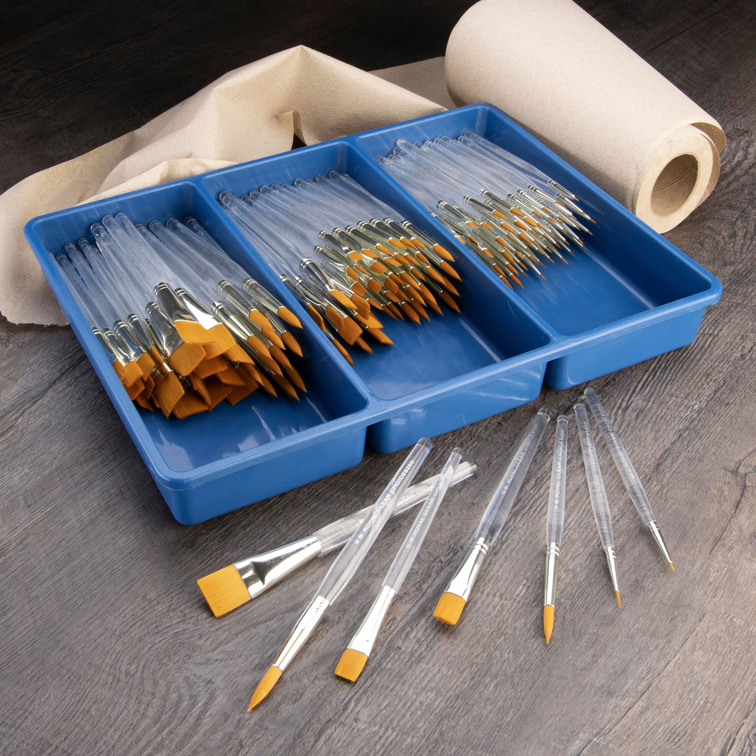 Royal Brush Paint Combo Pack includes 144 brushes with 12 each in round sizes of 20/0, 3/0, 1, 3, 5, 8, 10, and 12 each in flat sizes of 1/2 in, 3/4 in, and 12 each in shader sizes of 4, 8 and 12. These brushes have golden taklons with smooth aluminum ferrules and feature acrylic handles. Sold as 144 per pack.