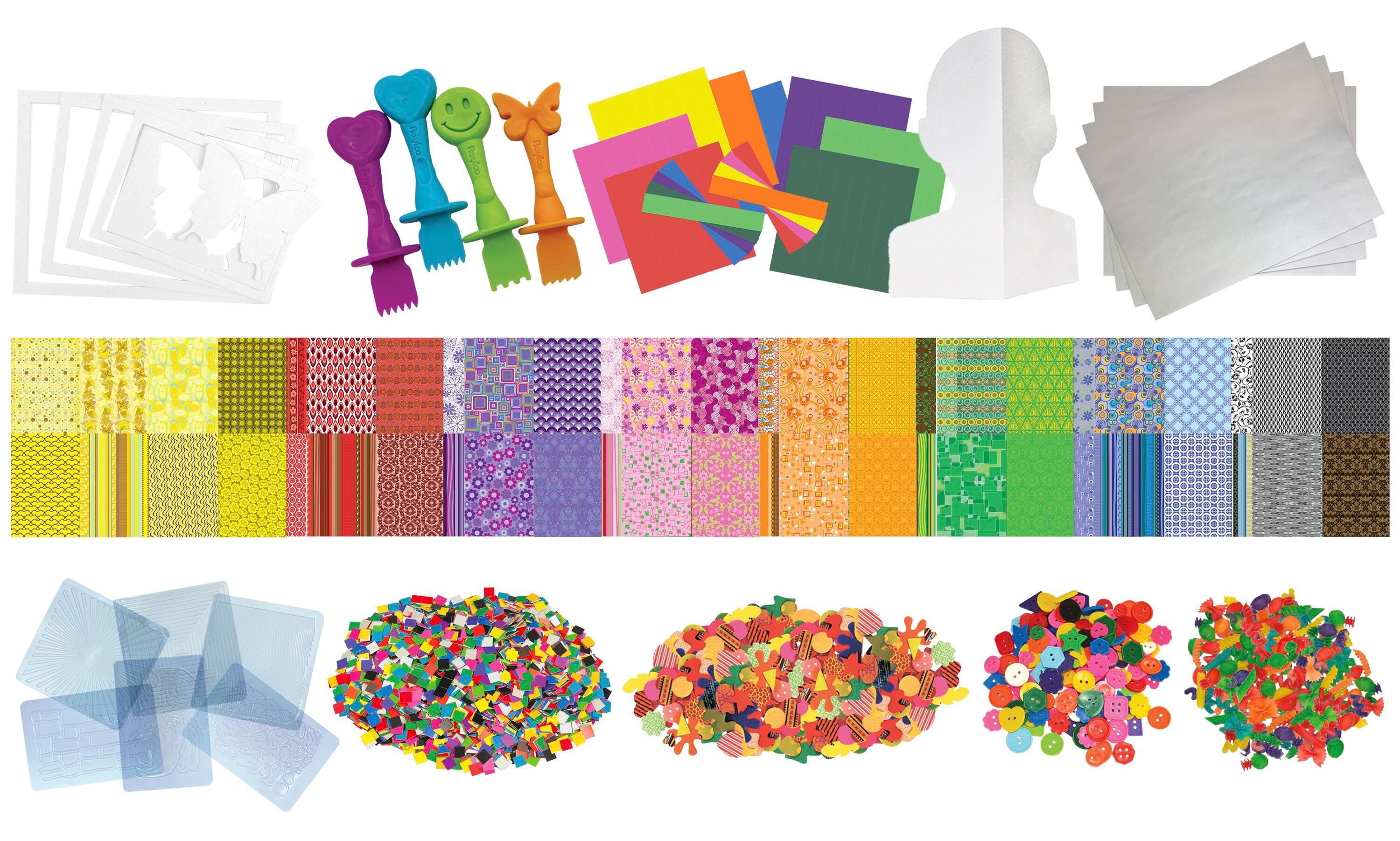- Includes 9x12 in Color Diffusing Paper - 50 Sheets, Decorative Hues Papers - 64 Sheets, 1lb Colored Macaroni, 1 lb Bright Buttons, 6 Assorted Texture Rubbing Plates, 500 Piece Paper Popz, 10 oz Double Color Mosaics, 24 Junior Goo Spreaders, 24 Stand-Up Self Portraits, 48 Double Sided Weaving Mats, 24 Cardstock Picture Frames