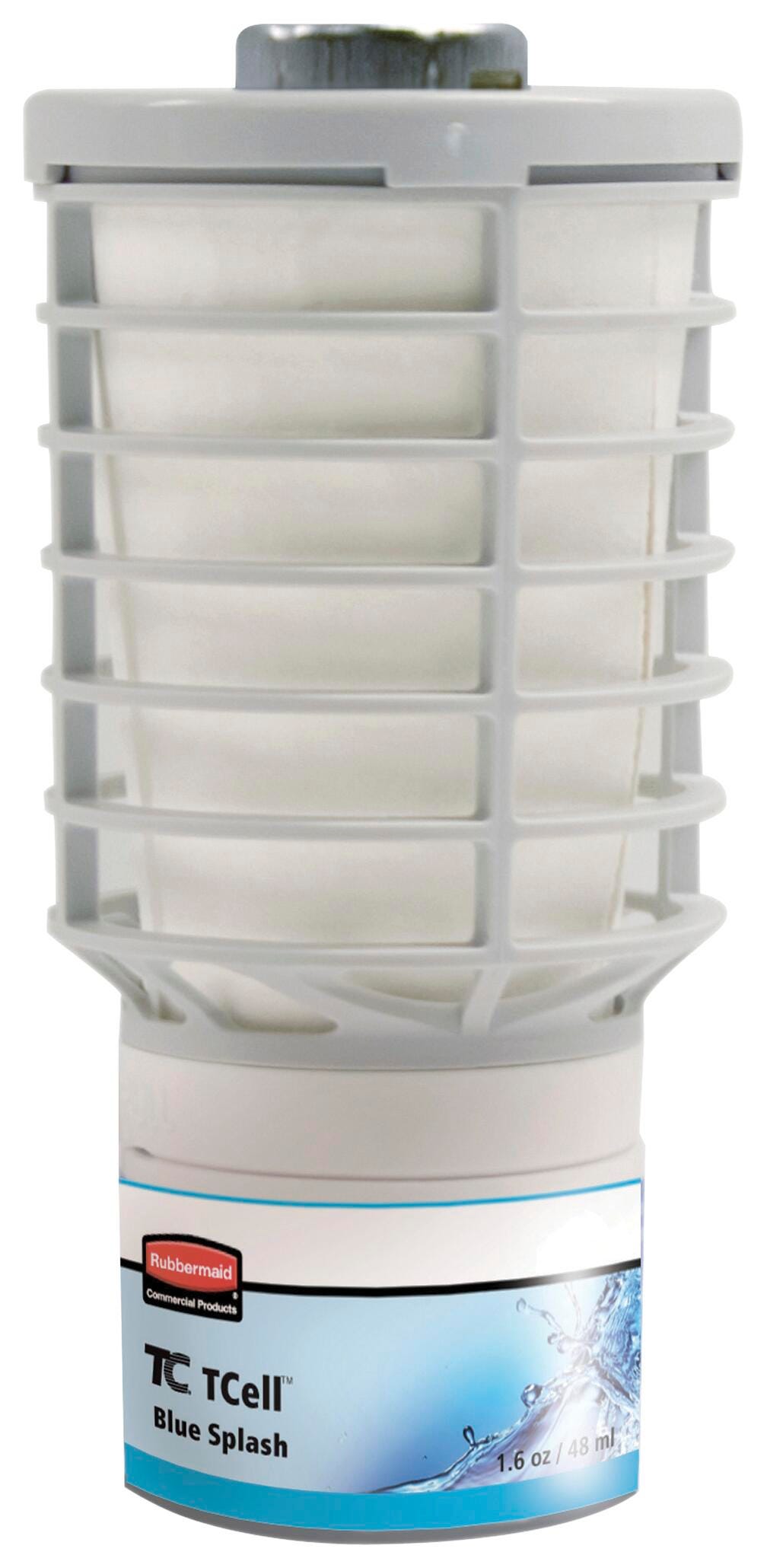 T-Cell air freshener refill is part of an odor-control system that dispenses a consistent level of fragrance and Microtrans odor neutralizer. Through a Rubbermaid T-Cell dispenser, the fresh fragrance and odor neutralizer are distributed throughout the room. Blue splash scent is hinged around bergamot, lemon, orange, lavender and rosemary, enhanced by a hint of mint and watery marine notes and supported by a base of lily, geranium, fern, amber and precious woods. Refill lasts approximately 60 days on the standard setting for a washroom with three to four stalls/fixtures. It can last approximately 90 days in a small washroom with one to two stalls/fixtures. Refill contains no propellants or added VOCs.